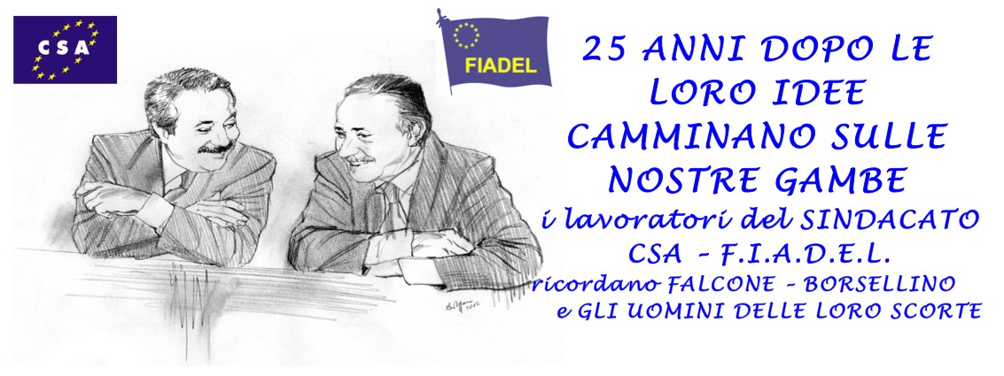 25 anni dopo le loro idee camminano sulle nostre gambe i lavoratori del SINDACATO CSA – F.I.A.D.E.L. ricordano FALCONE – BORSELLINO e gli UOMINI DELLE LORO SCORTE Navigazione articoli CONVEGNO Precarizzazione dello Stato Sociale e Servizio Sociale Professionale: andamento delle politiche di welfare e riconoscimento della professione e nuove strategie di tutela. CSA Sanità Corso ECM Il Benessere organizzativo nelle politiche del personale sanitario