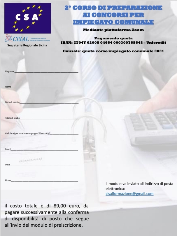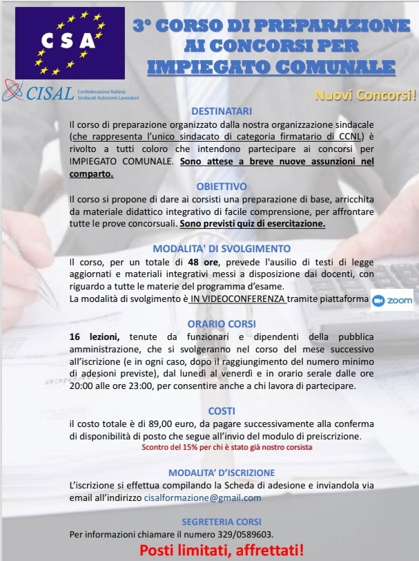CISAL FORMAZIONE Navigazione articoli Comune di Palermo, assemblea dei lavoratori part-time. Cgil, Cisl, Uil, Csa-Cisal: “Subito risposte dall’amministrazione o protesta” QUARTA EDIZIONE CORSO ASPIRANTI AGENTI DI POLIZIA LOCALE (locandina + modulo di adesione)