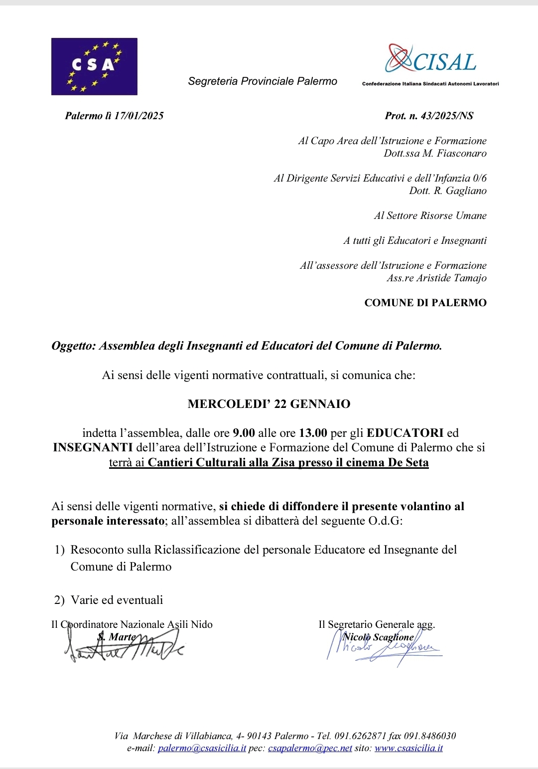 Navigazione articoli Educatori del comune di Palermo, Csa-Cisal: “Per la riqualificazione si usino fondi Fsc” Segr. Naz. CSA, comunicato resoconto riunione del tavolo di trattativa sul rinnovo del contratto F.L. del 21 gennaio