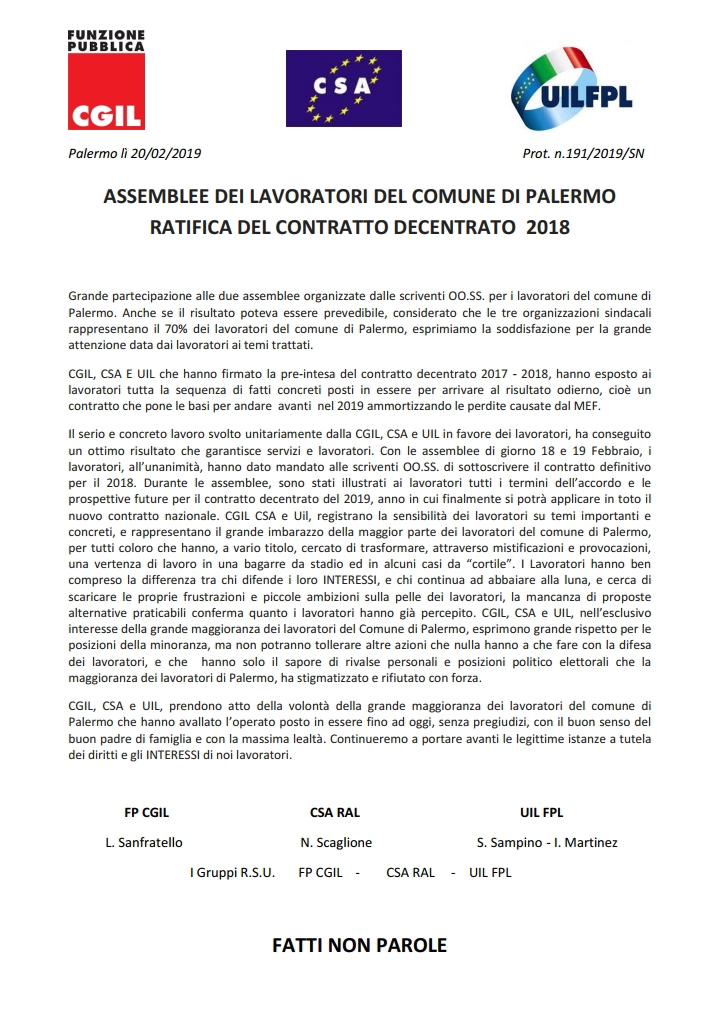 #sindacatodelfare #sindacatoresponsabile Navigazione articoli CGIL-CSA-UIL, 19 Febbraio 2019 foto assemblea generale di tutti i dipendenti del Comune di Palermo. FPCGIL-CSARAL-UILFPL, Richiesta attivazione percorso amministrativo di stabilizzazione.