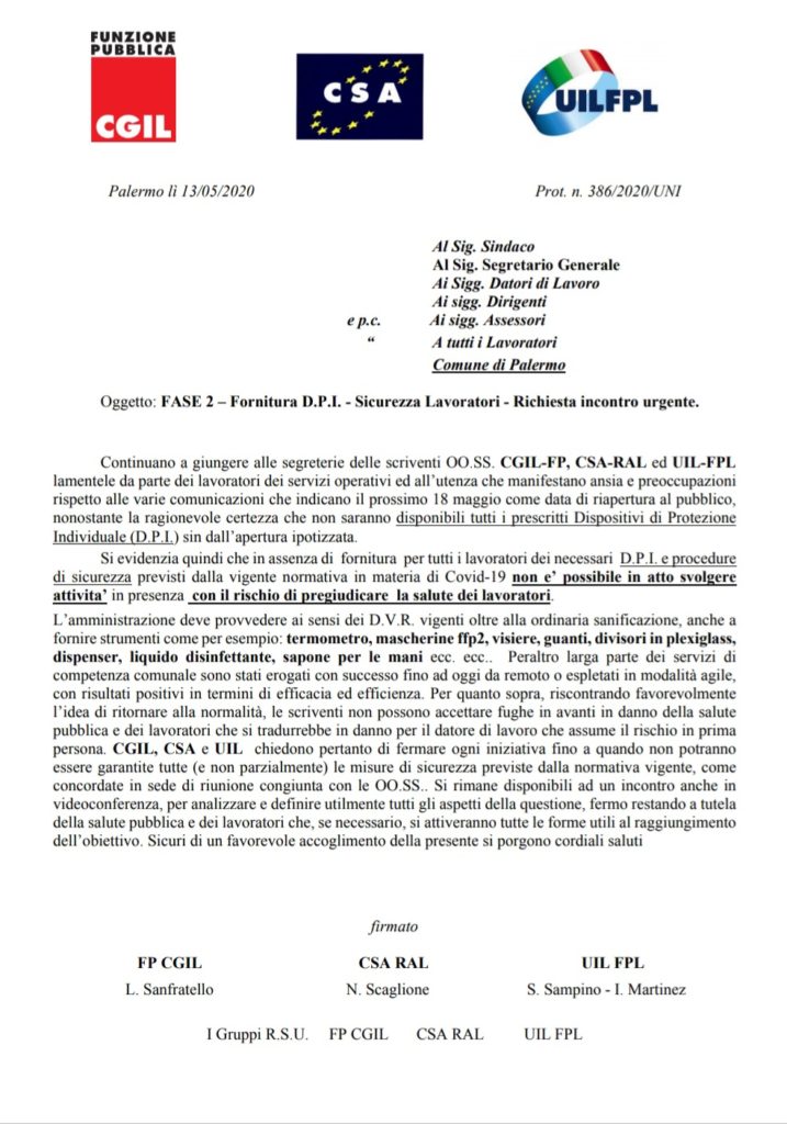 Navigazione articoli CGIL-CSA-UIL, Richiesta incontro su personale CIT Gruppi RLS CGIL-CSA-UIL, Attivazione misure di prevenzione e contenimento da rischio contagio Covid-19