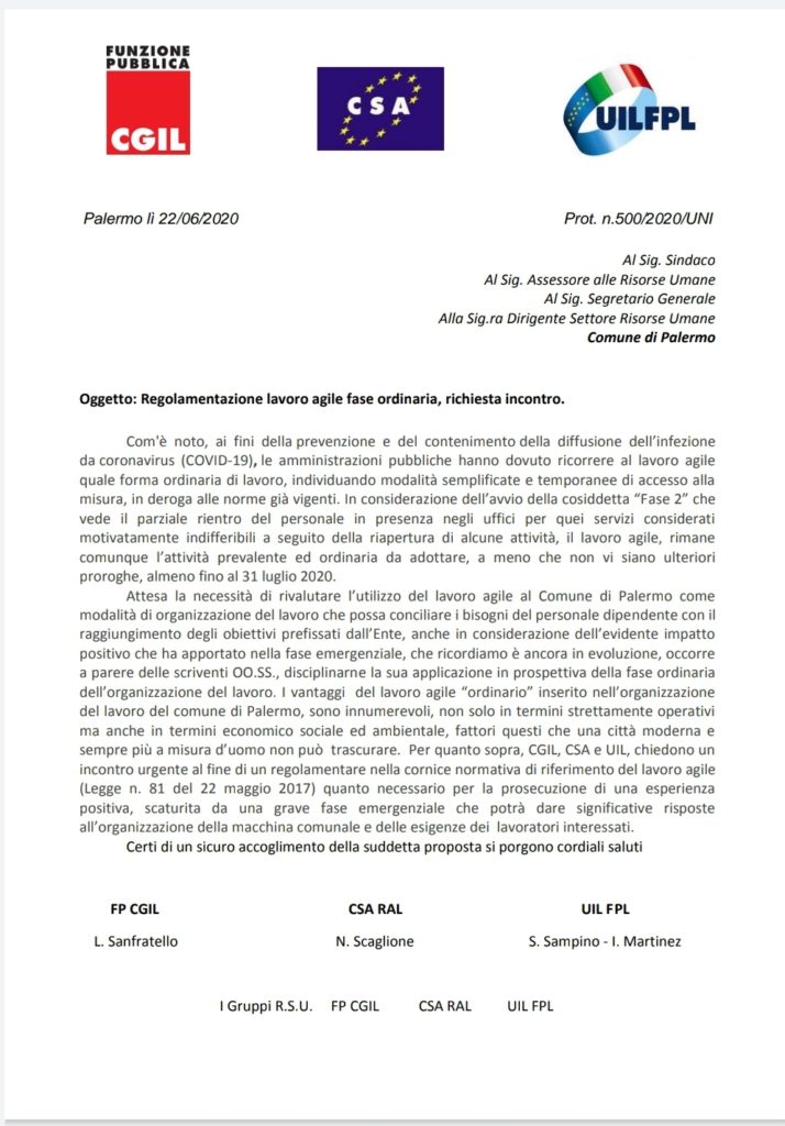 Navigazione articoli FP CGIL – CSA RAL – UIL FPL COMUNICATO SINDACALE CGIL-CSA-UIL, Richiesta incontro – Regolamentazione lavoro agile fase ordinaria, e monitoraggio applicazione Protocollo di Sicurezza. Nota per i Comuni della Provincia di Palermo