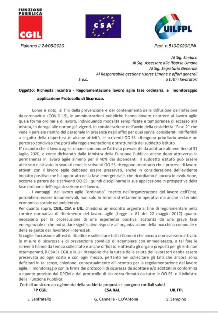 Navigazione articoli CGIL-CSA-UIL, Regolamentazione lavoro agile fase ordinaria, richiesta incontro CSA CISAL, Seus 118 Nota firma protocollo Sanità COVID