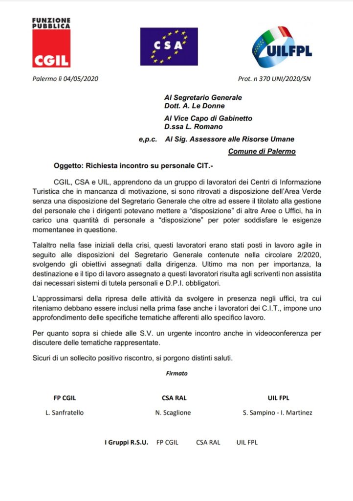 Navigazione articoli CGIL-CSA-UIL, Comunicazione urgente Segretario Generale del 01/05/2020 richiesta chiarimenti CGIL CSA UIL: Circ e Post FASE 2 – Fornitura D.P.I. – Sicurezza Lavoratori – Richiesta incontro urgente