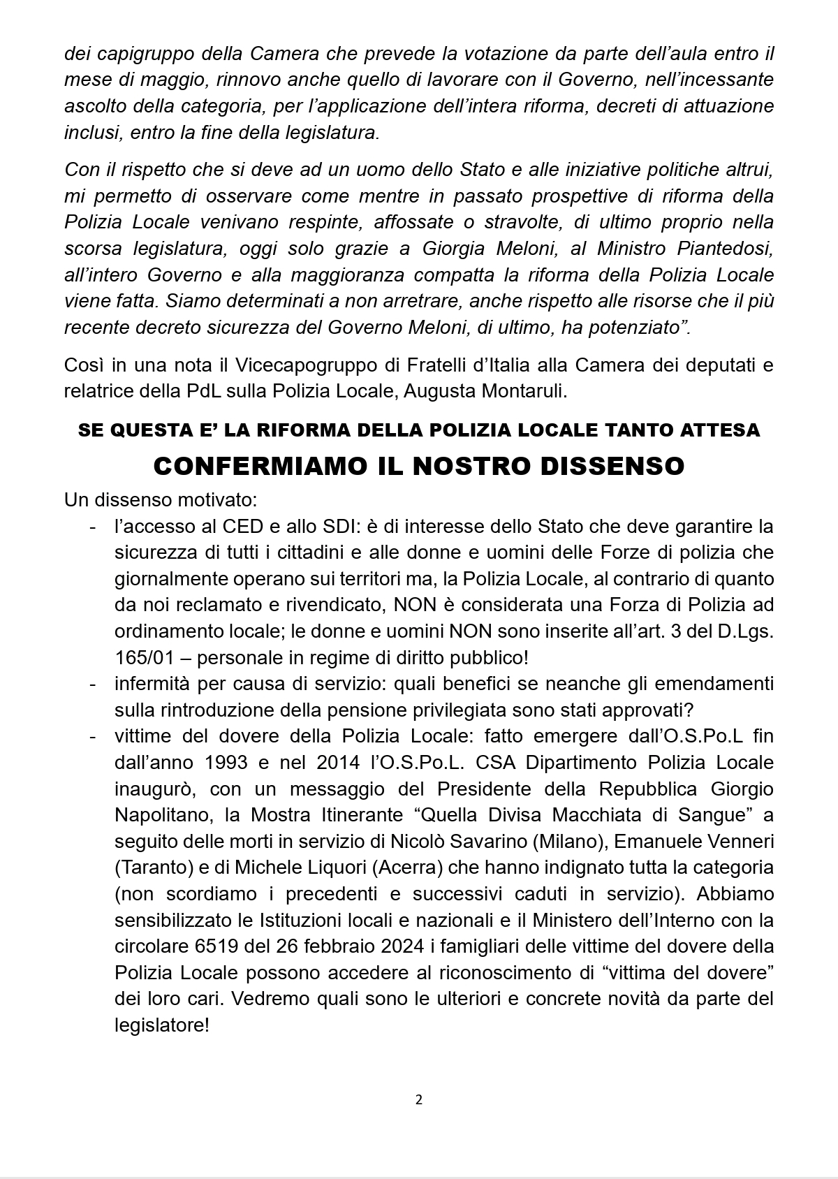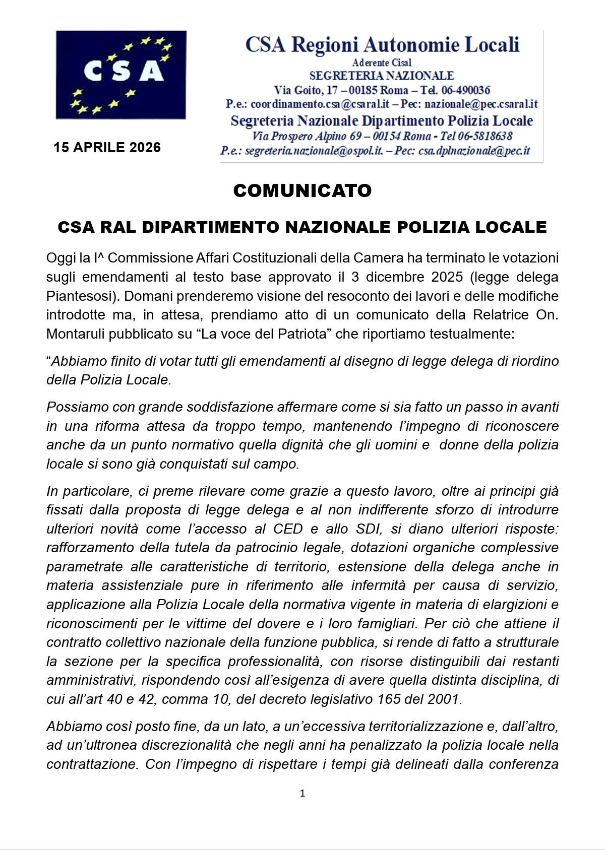 COMUNICATO CSA RAL DIPARTIMENTO NAZIONALE POLIZIA LOCALE