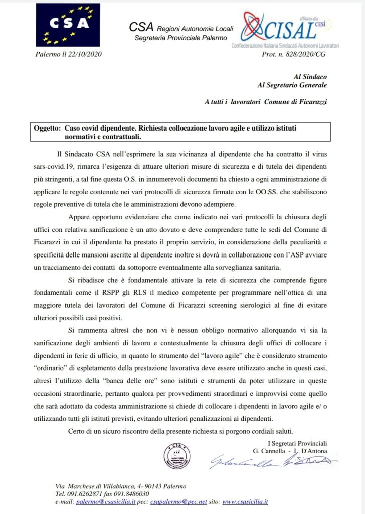Comune di Ficarazzi Navigazione articoli RLS Gruppo CSA, Richiesta screening sierologico e o tamponi a tutti i dipendenti. Ufficio Anagrafe CSA, Personale ASU – Misure urgenti in materia di contenimento e gestione dell’emergenza epidemiologica.
