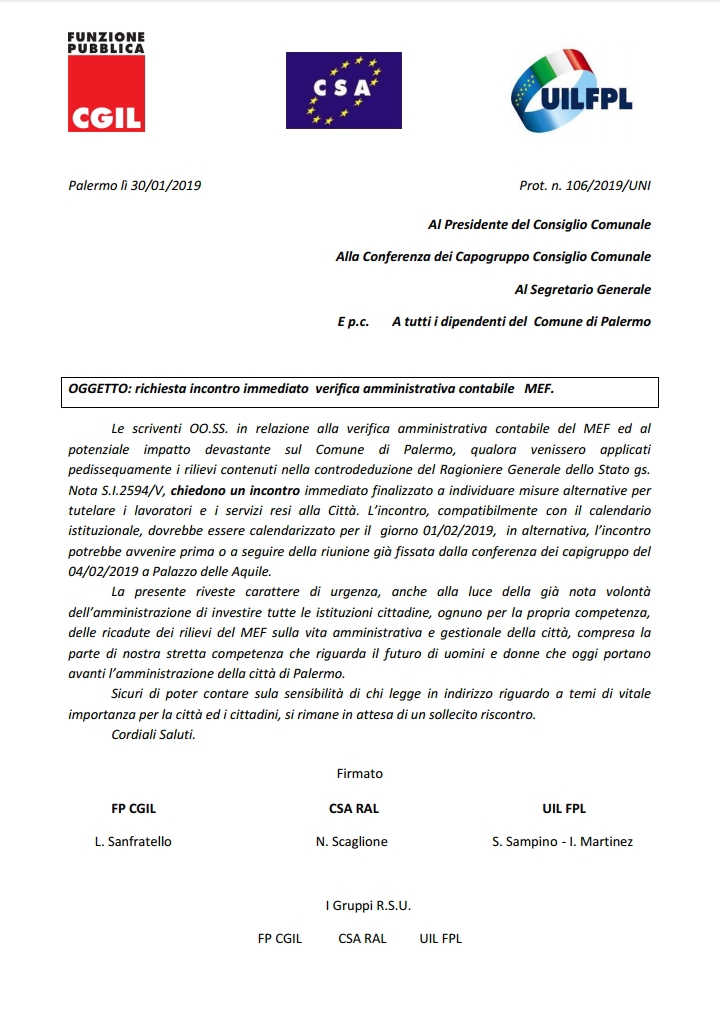 Navigazione articoli “Rilievi del Mef sul Comune. Serve un tavolo in Prefettura”. CSA-CGIL-UIL, Volantino su Delibera G.C. n.° 14 del 30/01/2019.
