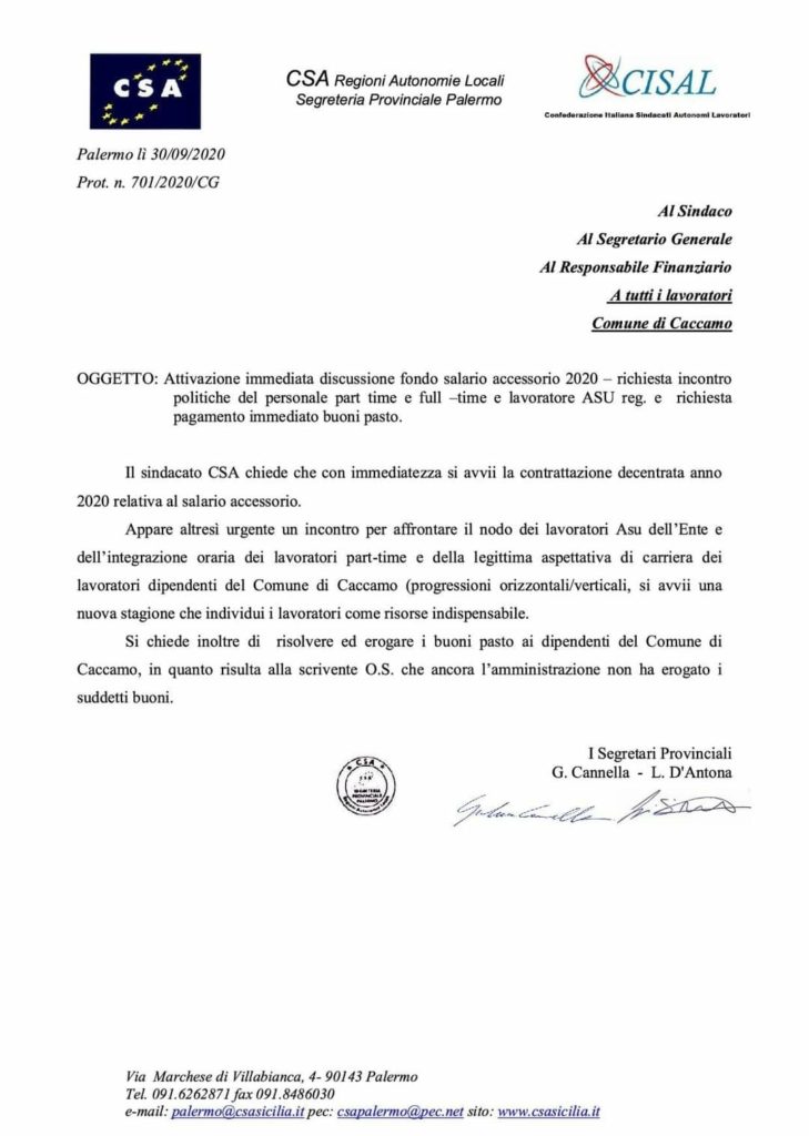 A tutti i Dipendenti del Comune di Caccamo. Navigazione articoli CSA CISAL, Richiesta intervento per avvio contrattazione decentrata normativa e economica 2018/2019/ 2020 – avviso di comportamento antisindacale ex art.28 L.300/70. CSA CISAL, Richiesta incontro.