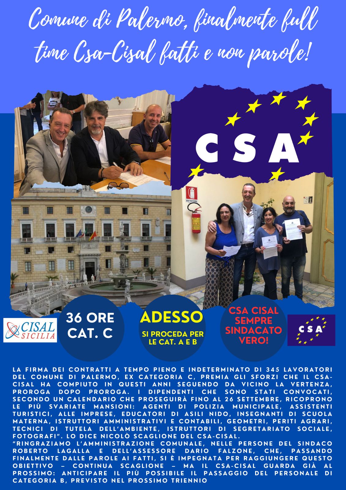 CSA sempre e solo Sindacato Vero!! Navigazione articoli Palermo, al Comune via all’aumento ore per 345 lavoratori. Csa-Cisal: “Adesso si passi alla categoria B” CSA CISAL, Comune di Palermo firma contratti full-time ex ctg. C.