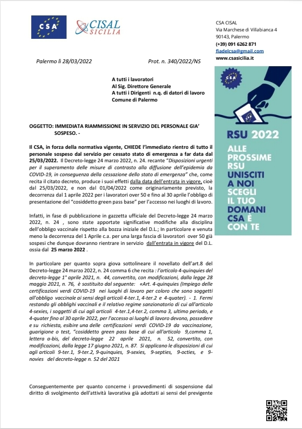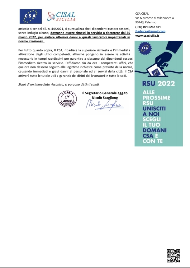 Navigazione articoli Comune di Palermo, accordo con Roma in bilico. Scaglione (Csa Cisal): “Preoccupazione per i lavoratori” CSA CISAL, Indennità di servizio esterno per la P.M. – errore di calcolo dell’importo unitario personale part-time (a tempo parziale)