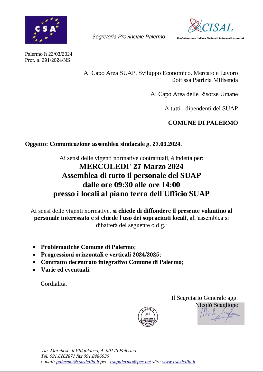 Navigazione articoli CSA Cisal, comunicazione assemblea sindacale g. 25.03.2024 per il personale dell’Ufficio Anagrafe e Stato Civile comprese le 5°, 6°,7°,8° Circoscrizioni e postazioni decentrate collegate CSA Cisal, Precisazioni sull’assemblea sindacale del 25.03.2024
