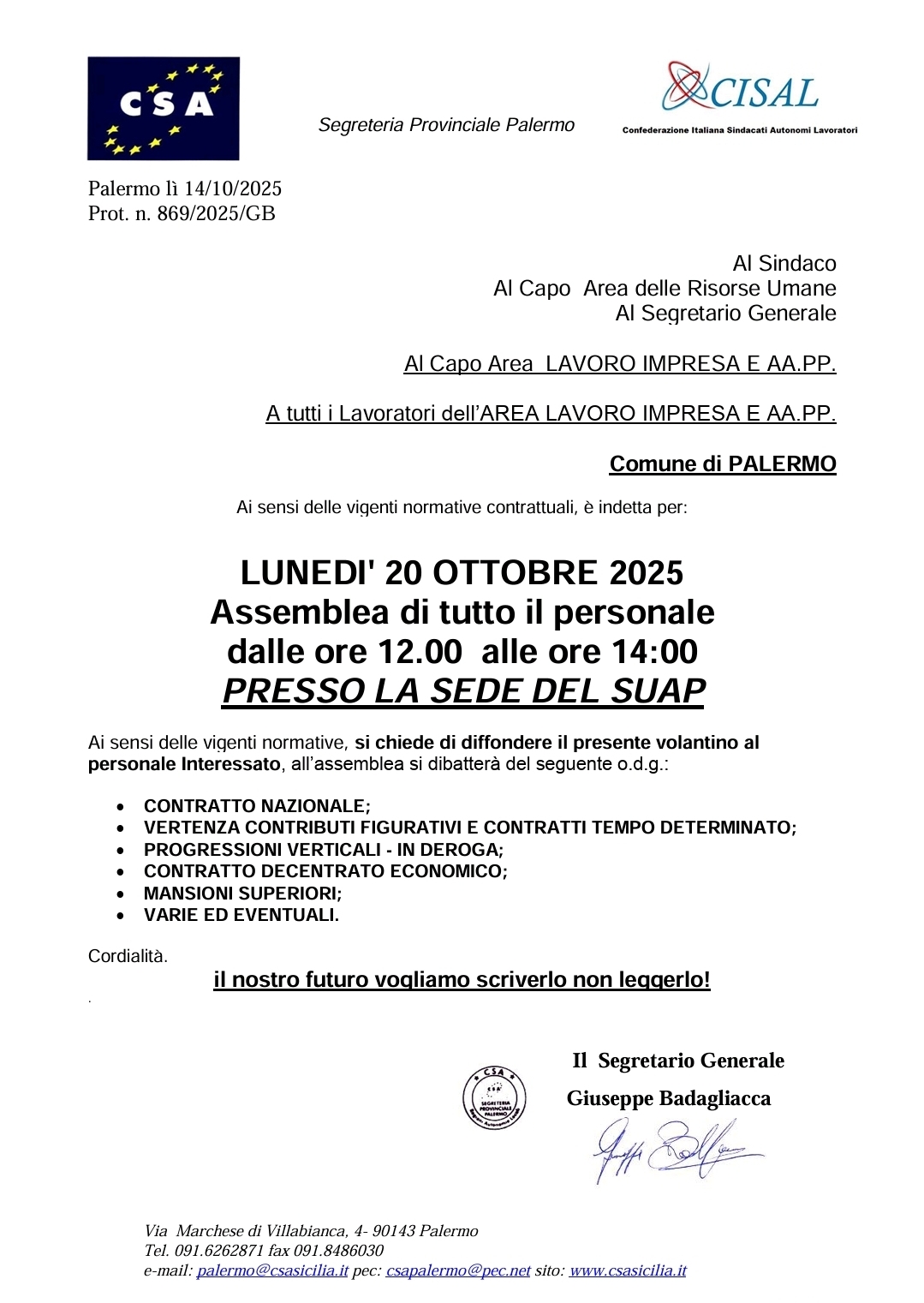 Navigazione articoli CSA CISAL, Vertenza per il riconoscimento delle differenze retributive per mansioni superiori CSA CISAL, Assemblea di tutti i dipendenti dell’area istruzione e formazione del Comune di Palermo g. 27.10.2025