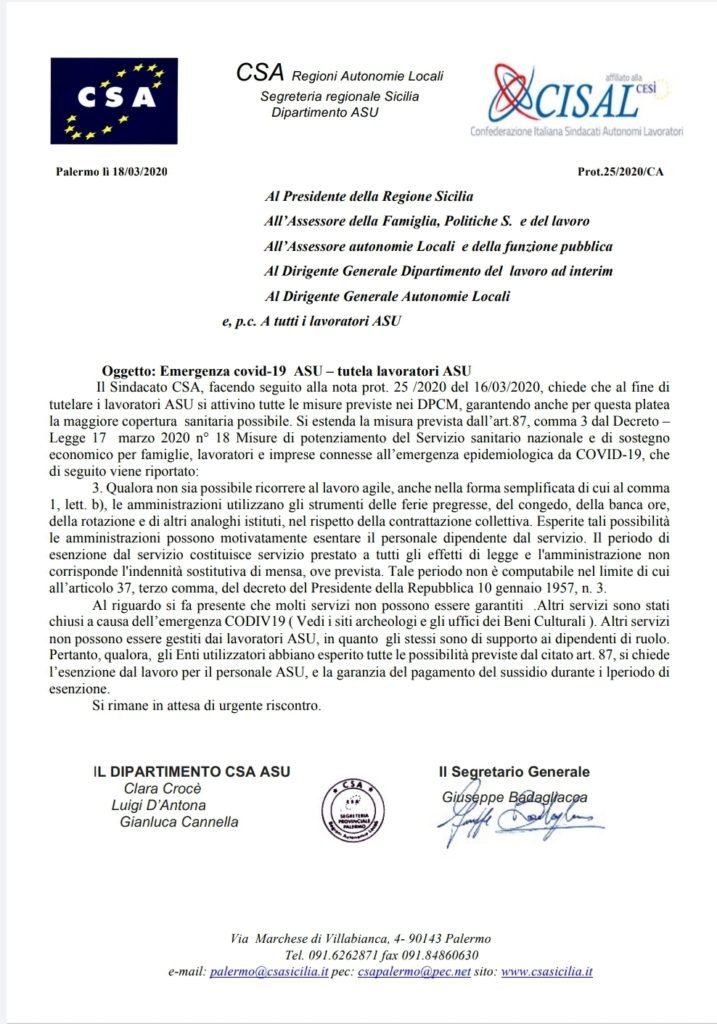 Navigazione articoli CSA CISAL Emergenza Sanitaria COVID 19 Decreto Legge #curaitalia ulteriori misure tutela lavoratori pubblici. Nota per i Comuni della Provincia di Palermo. Coronavirus: Csa-Cisal, non escludere vigili dai controlli “Sarebbe incomprensibile, oltre che dannoso per la collettività” (ANSA)