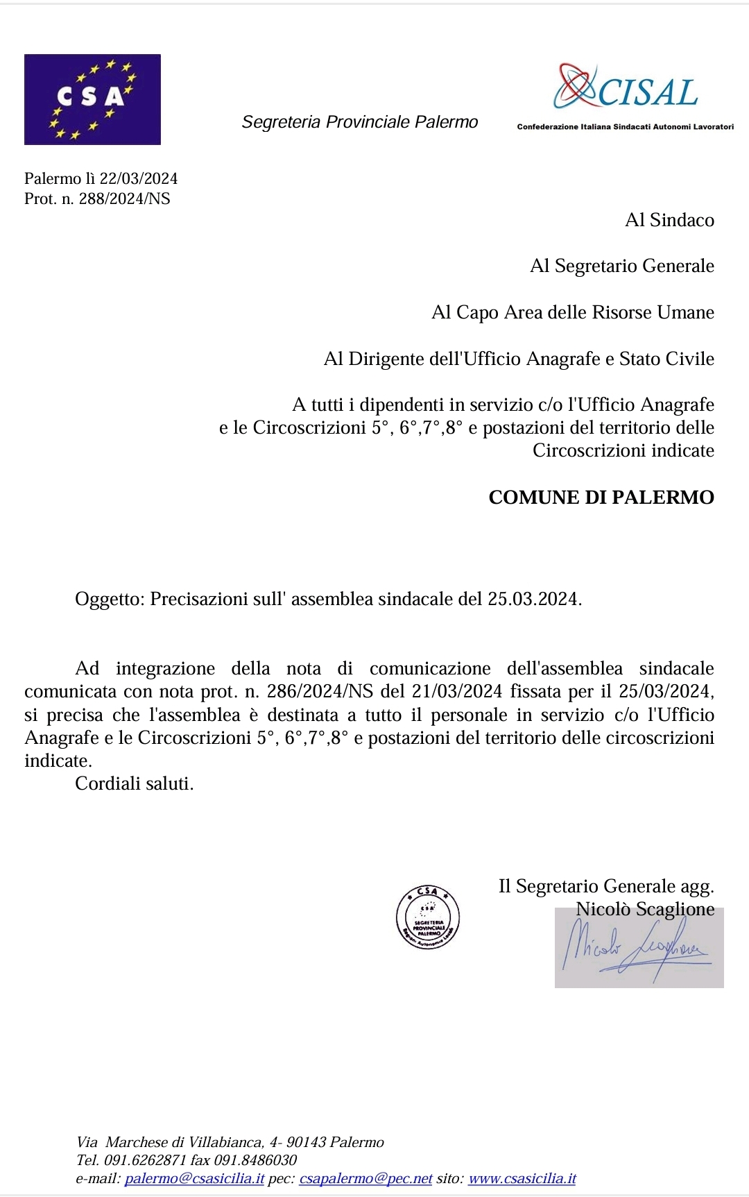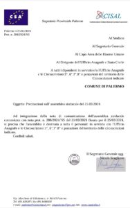 Navigazione articoli CSA Cisal, Comunicazione assemblea personale SUAP g. 27.03.2024 Palermo, sindacati incontrano Comitato ordine e sicurezza: “Inaccettabili le aggressioni alla Polizia municipale, servono più risorse”