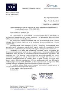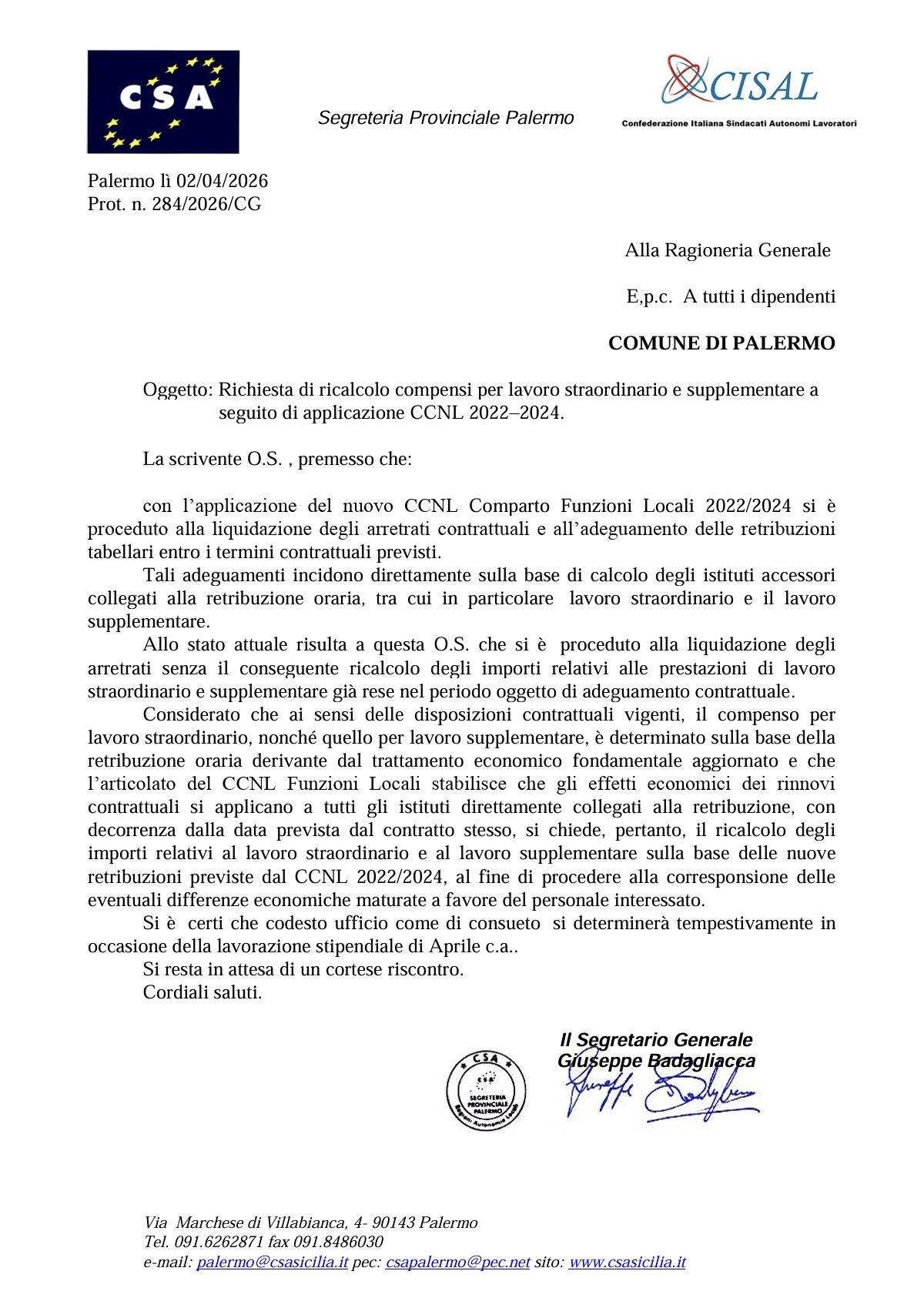 Navigazione articoli CSA CISAL, Richiesta attività di vigilanza per la sicurezza negli uffici del sociale e abitare sociale. COMUNI PROVINCIA DI PALERMO – CSA CISAL, Richiesta di ricalcolo compensi per lavoro straordinario e supplementare a seguito di applicazione CCNL 2022–2024.