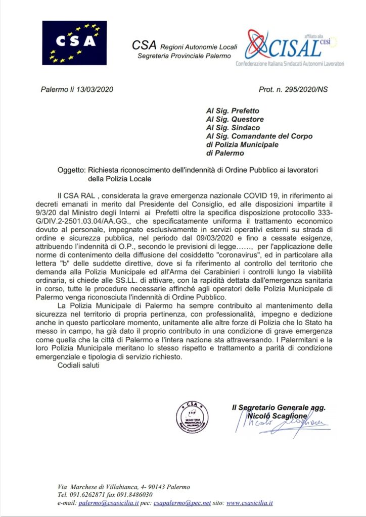 Navigazione articoli FP CGIL – CSA RAL – UIL FPL, Emergenza Sanitaria COVID 19 Direttiva n°209605/USG 12 Marzo 2020 richiesta applicazione art 19 DPCM n.9 del 2/03/2020, smart working, telelavoro, sanificazione ambienti. CSA CISAL, Richiesta riconoscimento dell’indennità di Ordine Pubblico ai lavoratori della Polizia Locale. A tutti gli Enti Locali della Regione Sicilia.