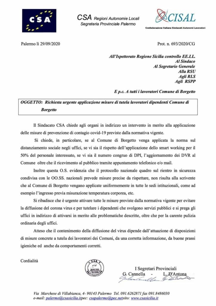 A tutti i Dipendenti del Comune di Borgetto. Navigazione articoli A tutti i Dipendenti della P.M. di Termini Imerese. CSA CISAL, Richiesta chiarimenti disposizione di servizio “assegnazione ferie d’ufficio personale in forza settore P.M.” CSA CISAL, Richiesta incontro problematiche personale dipendente e lavoratori PM