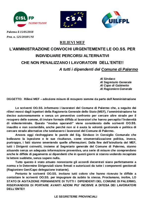 Navigazione articoli CSA, COMUNICATO STAMPA VERTENZA ART 13 L.R.17/90 PROCLAMAZIONE RSU COMUNE DI PALERMO