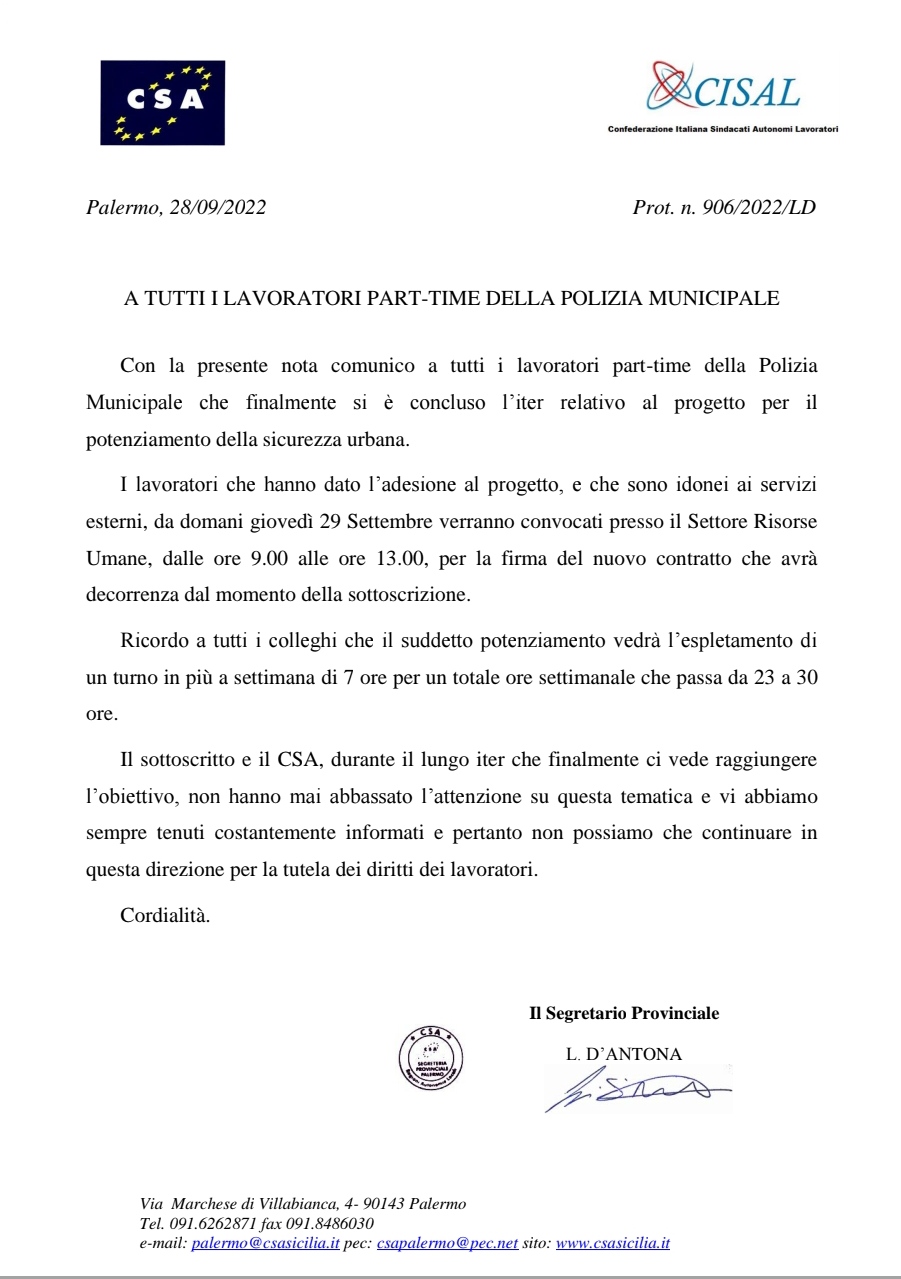 Navigazione articoli L. 142/22 – Lavoro Agile, proroga per i “Fragili” ed i genitori di figli con meno di 14 anni. Palermo, 130 vigili passano a 30 ore. Scaglione (Csa-Cisal): “Ottimo risultato, adesso aumento ore per tutti i dipendenti”
