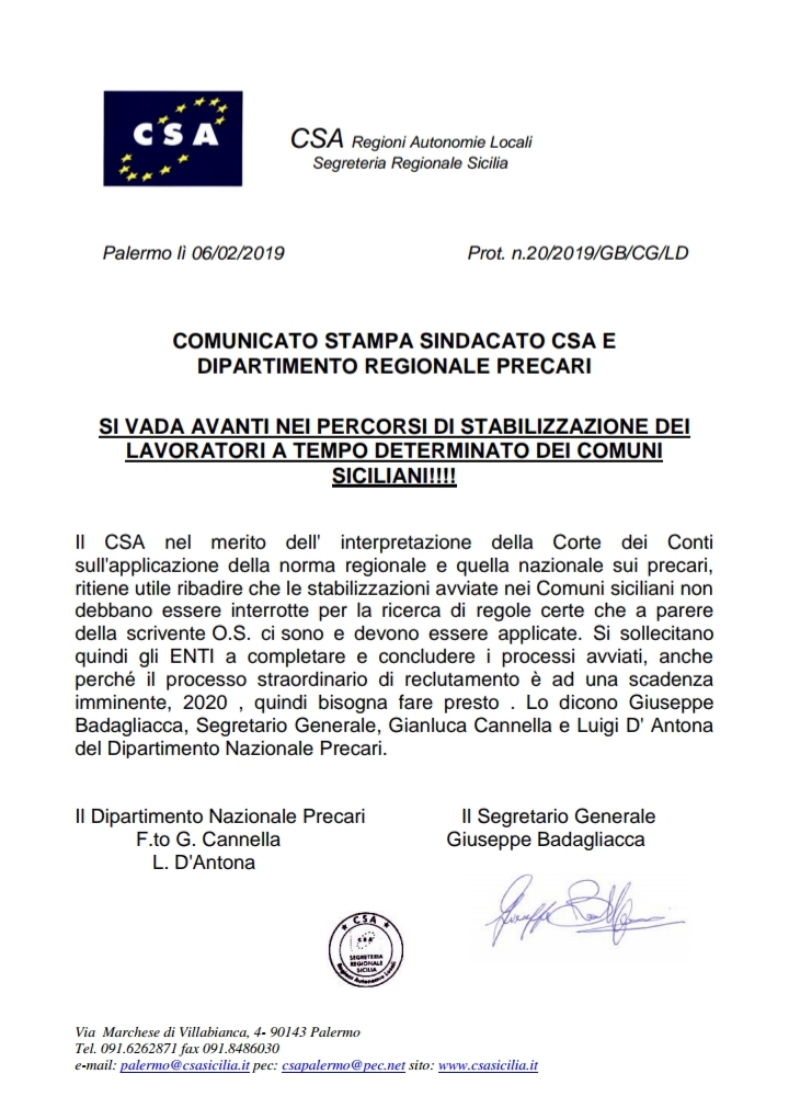 #csasindacatodelfare Navigazione articoli Interviste del Segr. Provinciale CSA Gianluca Cannella e del Segr. Generale Aggiunto CSA Nicola Scaglione CSA-CGIL-UIL, comunicato stampa post seduta consiglio comunale con l’intervento del Sindaco sui rilievi del MEF.
