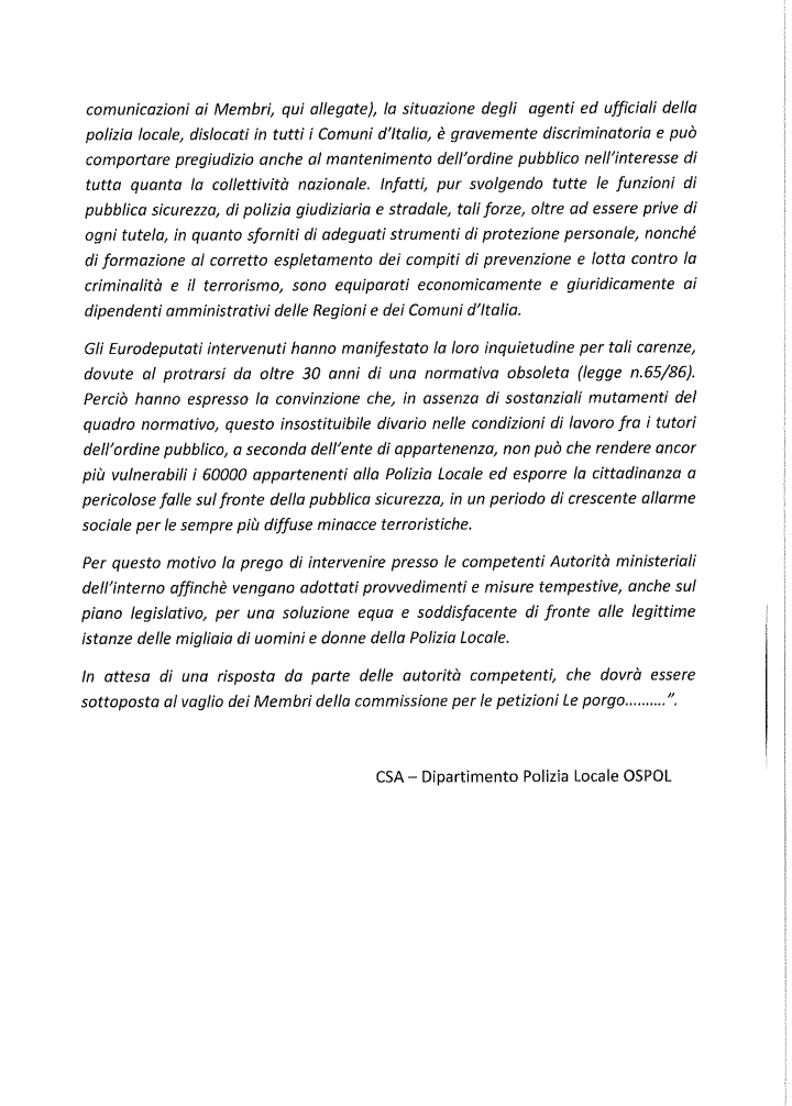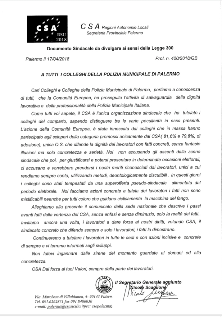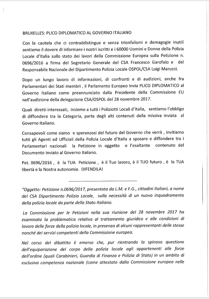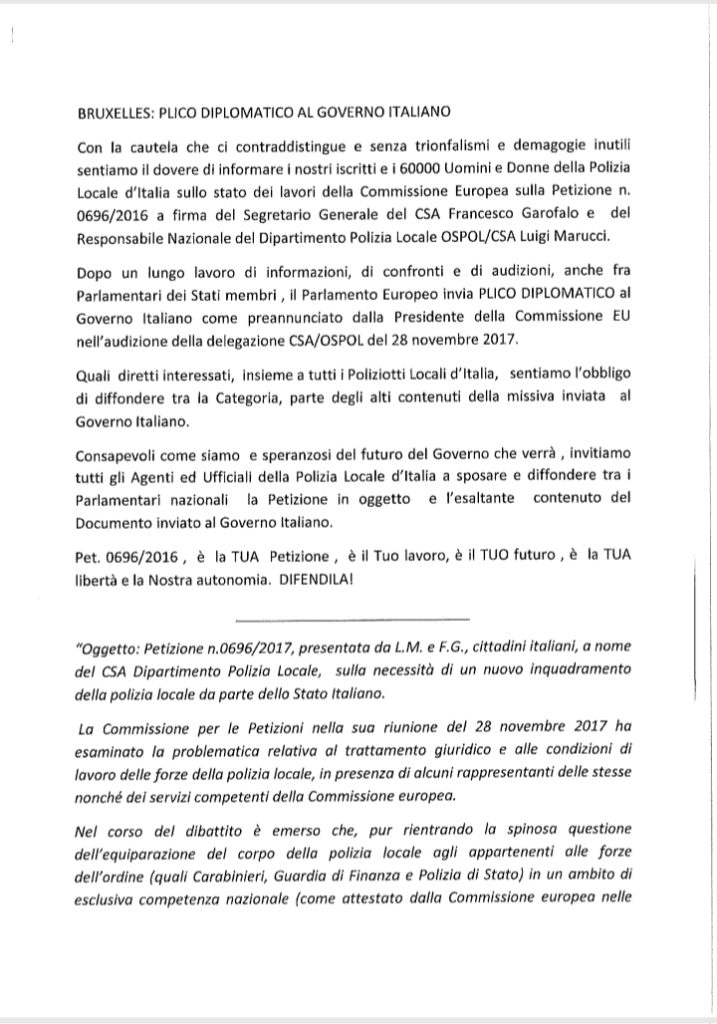 Comunicato Ospol: Bruxelles, plico diplomatico al governo italiano Navigazione articoli CSA Polizia Locale Comune di Palermo Video Intervista CSA Polizia Municipale Palermo: Sbloccato il pagamento del 208.