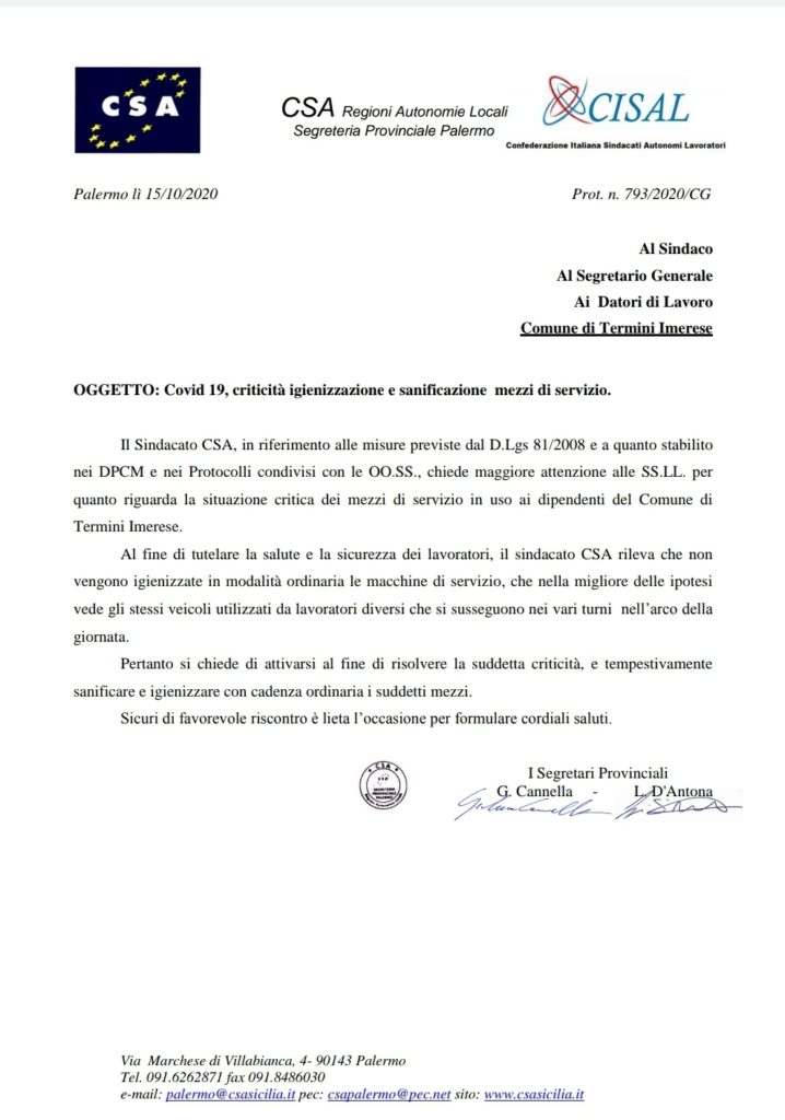 Comune di Termini Imerese Navigazione articoli CSA RAL – UILFPL, Nomine di preposto per le Unità Didattiche Educative conferite dal Datore di Lavoro Dott.ssa Fiasconaro RLS Gruppo CSA, Misure adottate ai fini del contenimento del Covid-19 – criticità attività di sopralluoghi tecnici.
