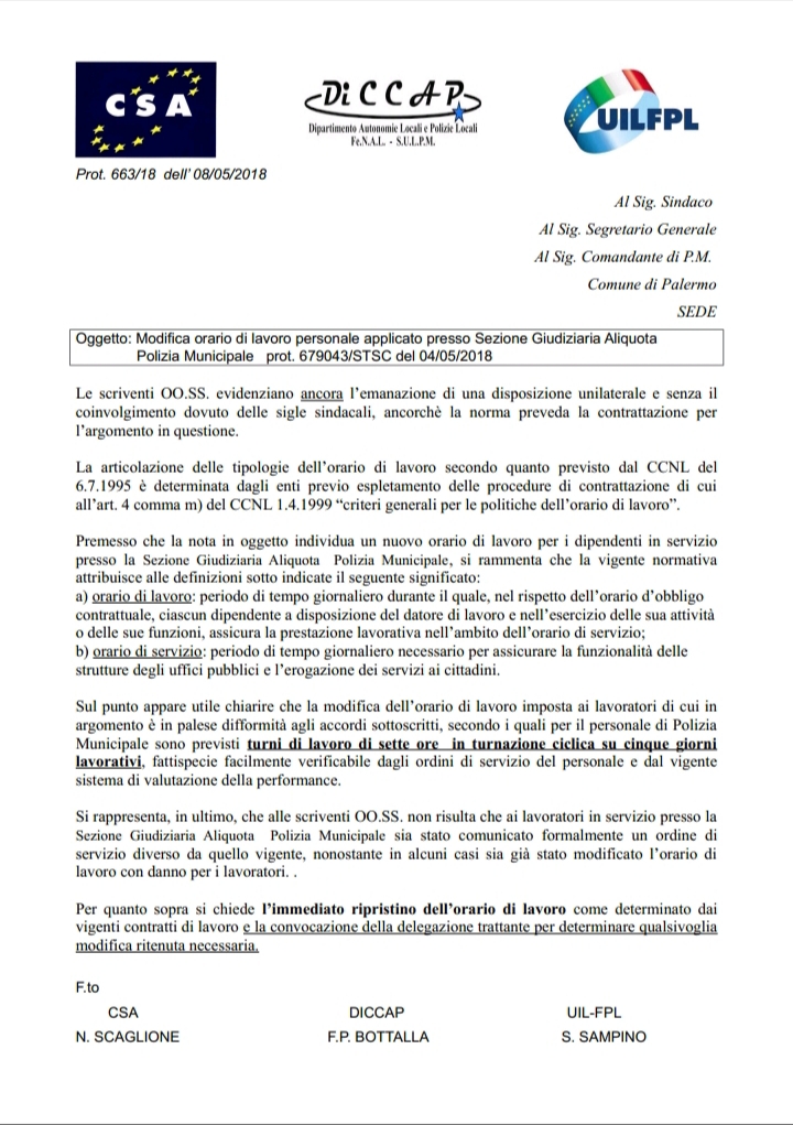 Navigazione articoli Il CSA chiede il massimo rispetto per i lavoratori dipendenti del Comune di Palermo. CSA-DICCAP-UILFPL: immediata revoca circolare n.20/2018 del 30/04/2018 a firma del Dott. G. Marchese.