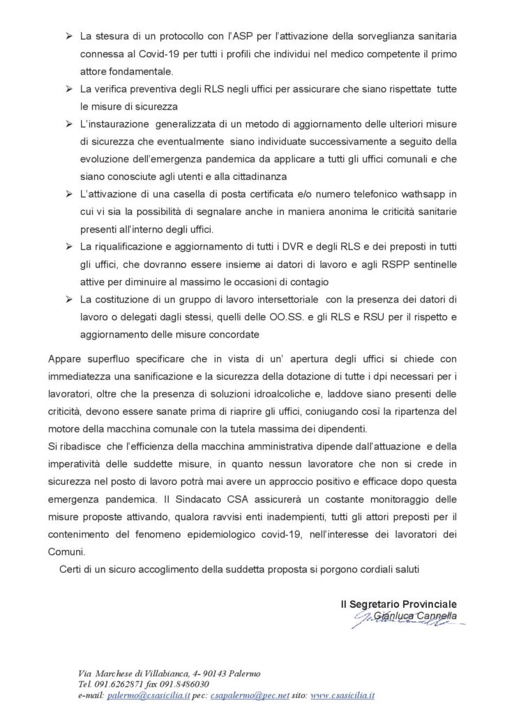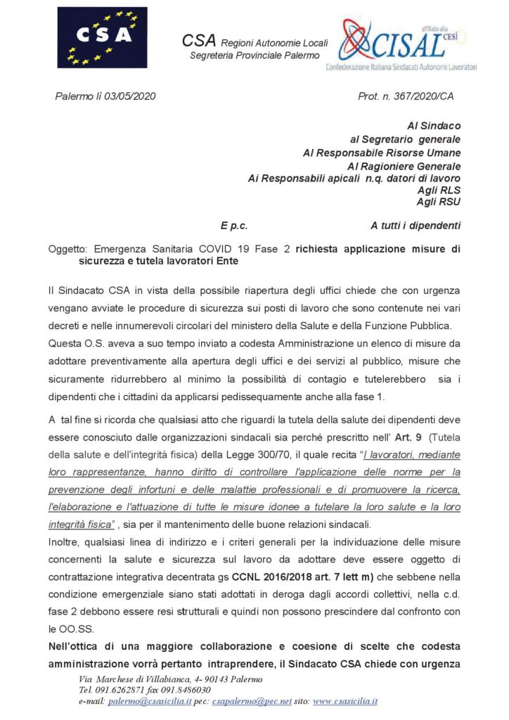 Nota per i Comuni della Provincia di Palermo Navigazione articoli CSA, Coronavirus – Indennità di Ordine Pubblico Polizia Locale CGIL-CSA-UIL, Comunicazione urgente Segretario Generale del 01/05/2020 richiesta chiarimenti