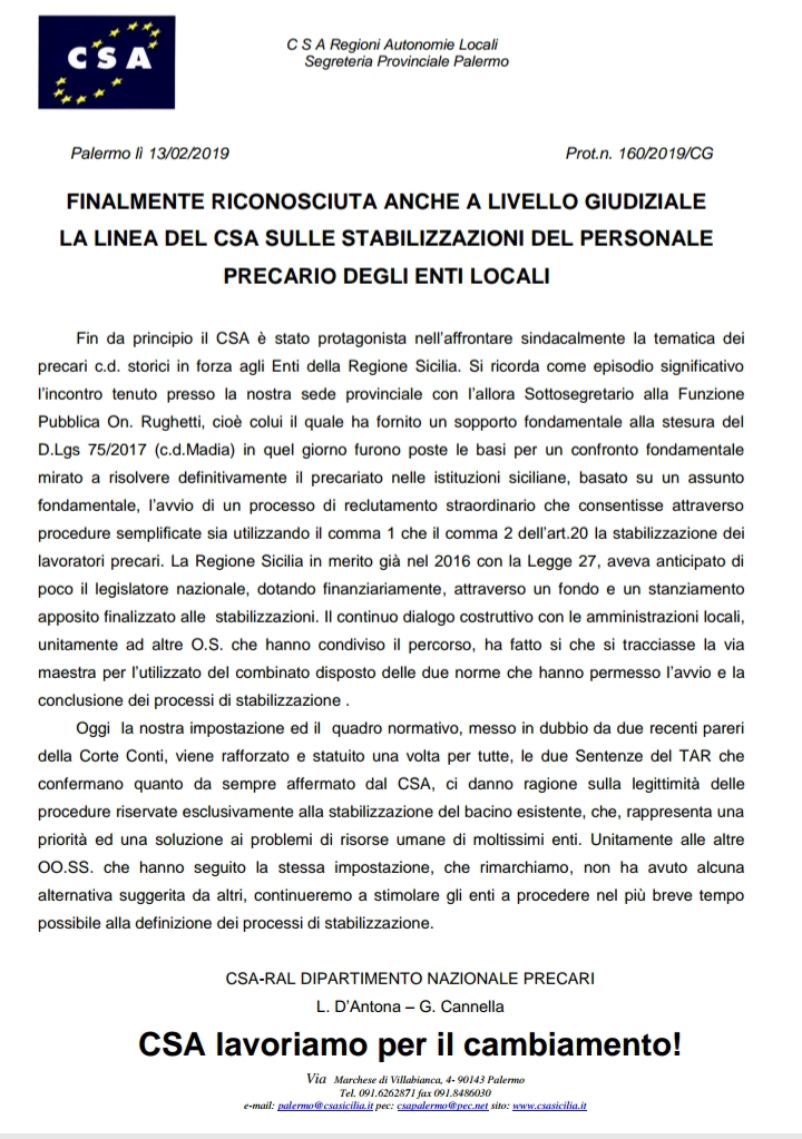 #csalavoriamoperilcambiamento Navigazione articoli Consiglio Nazionale CSA-FIADEL, comunicato conclusivo del Segretario Generale Francesco Garofalo FP CGIL-CSA RAL-UIL FPL ASSEMBLEA GENERALE DI TUTTI I DIPENDENTI DEL COMUNE DI PALERMO