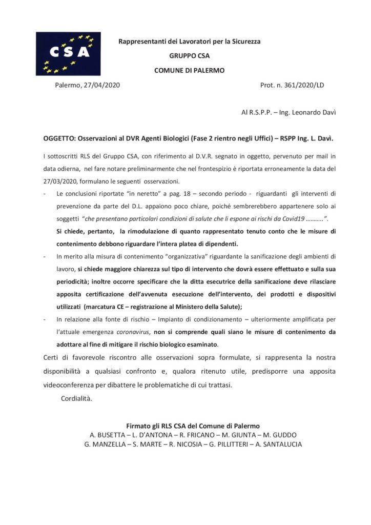 Navigazione articoli CSA, Appello forze politiche stabilizzazione Lavoratori ASU CSA gruppo RLS, Osservazioni al documento “Integrazione “Analisi rischio biologico e fase 2” per il Settore della Cittadinanza Solidale” – Arch. G. Parisi