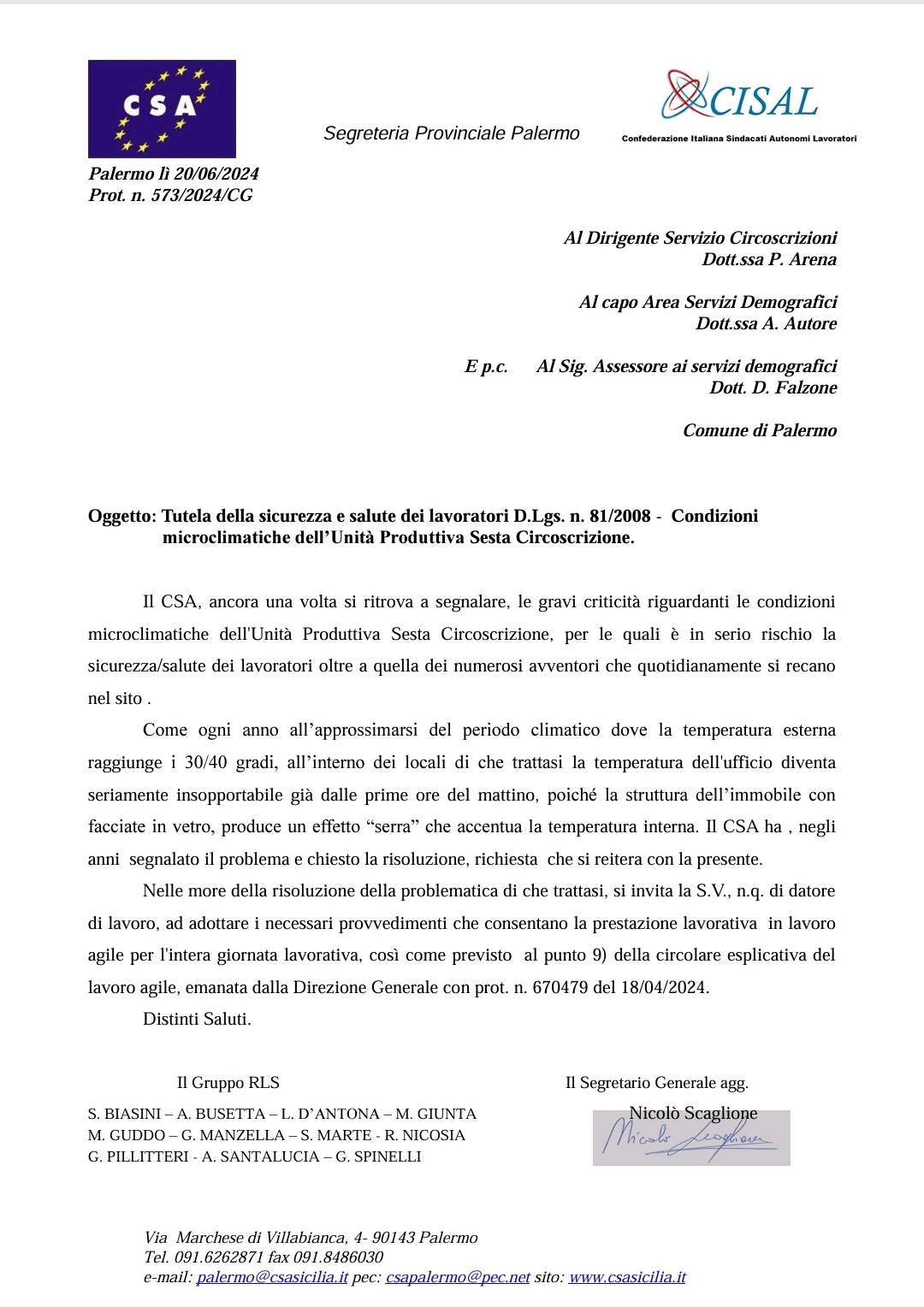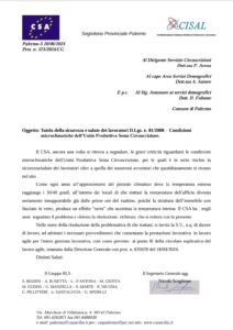 Navigazione articoli Comune di Palermo, Csa-Cisal: “Bene progressioni verticali nell’interesse della città” CSA Gruppo RLS: Tutela della sicurezza e salute dei lavoratori D.Lgs. n. 81/2008 – Condizioni microclimatiche dell’Unità Produttiva Polo Tecnico.