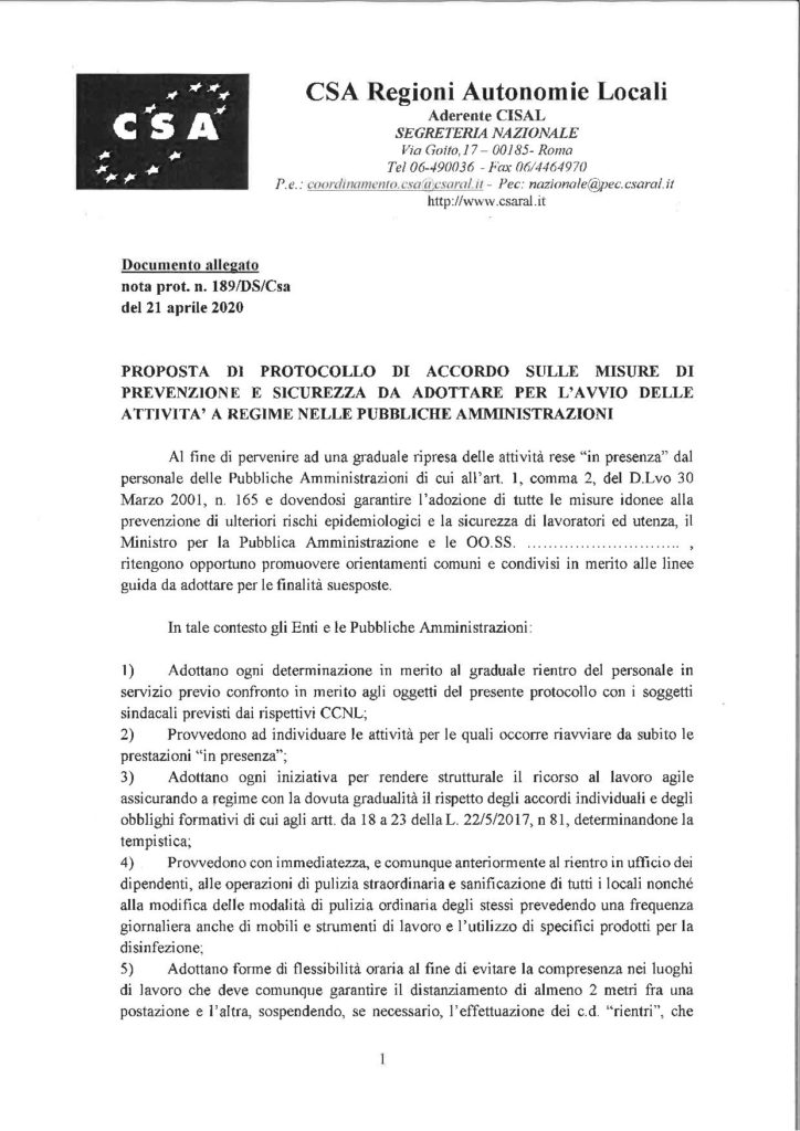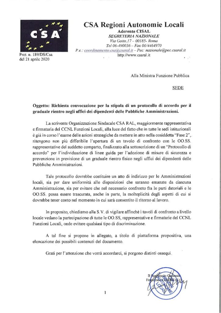 Richiesta convocazione per la stipula di un protocollo di accordo per il graduale rientro negli uffici dei dipendenti delle Pubbliche Amministrazioni; Proposta di protocollo