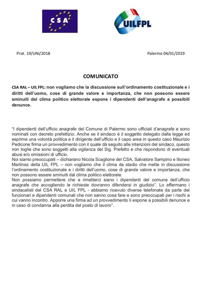 Navigazione articoli CSA RAL – FP CGIL – UIL FPL: COMUNICATO SOSPESI TUTTI I SERVIZI ESSENZIALI CSA-UIL, in difesa dei lavoratori dell’ufficio anagrafe del Comune di Palermo