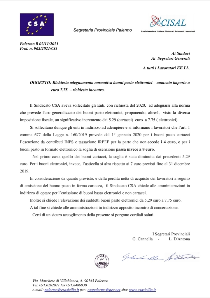 Ai Comuni della Provincia di Palermo Navigazione articoli CSA, Recupero delle ore chieste ai dipendenti e non dovute ai sensi dell’art. 1256 del c.c. Comune di Palermo, assemblea dei lavoratori part-time. Cgil, Cisl, Uil, Csa-Cisal: “Subito risposte dall’amministrazione o protesta”