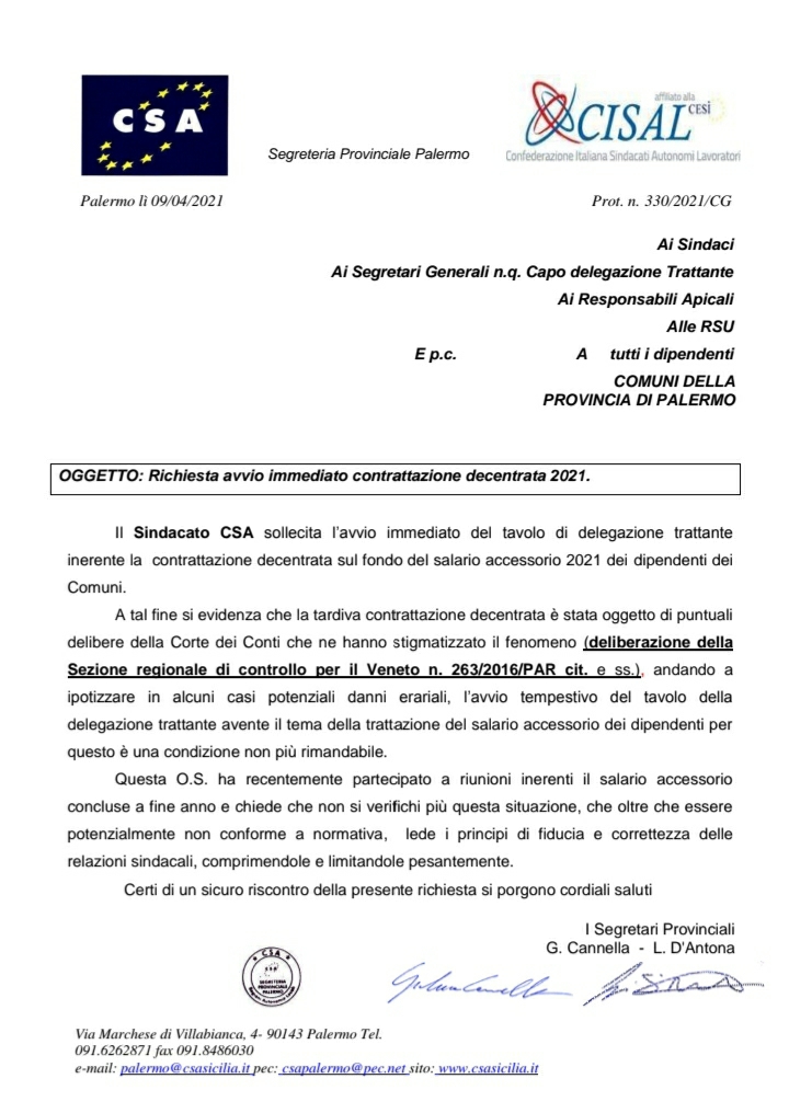 Ai Comuni della Provincia di Palermo Navigazione articoli CSA, Zona rossa Emergenza Sanitaria COVID 19 implementazione lavoro agile e attivazione misure di sicurezza massima per tutela lavoratori Ente – Richiesta percentuale dipendenti in lavoro agile. CGIL-CSA-UIL, RESOCONTO INCONTRO DI DELEGAZIONE TRATTANTE DEL 12/04/2021