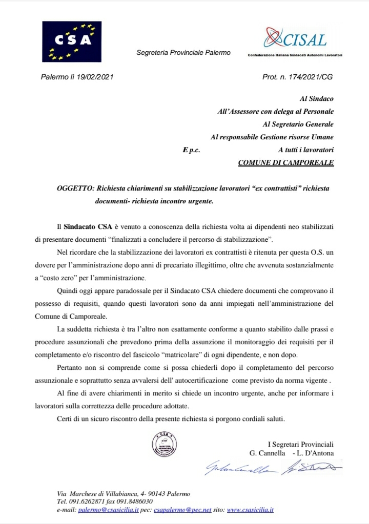 Comune di Camporeale Navigazione articoli CSA, Indennità di Vigilanza personale part-time Comando P.M. – richiesta incontro. CSA, Richiesta erogazione indennità di specifiche responsabilità – FES 2013/2019