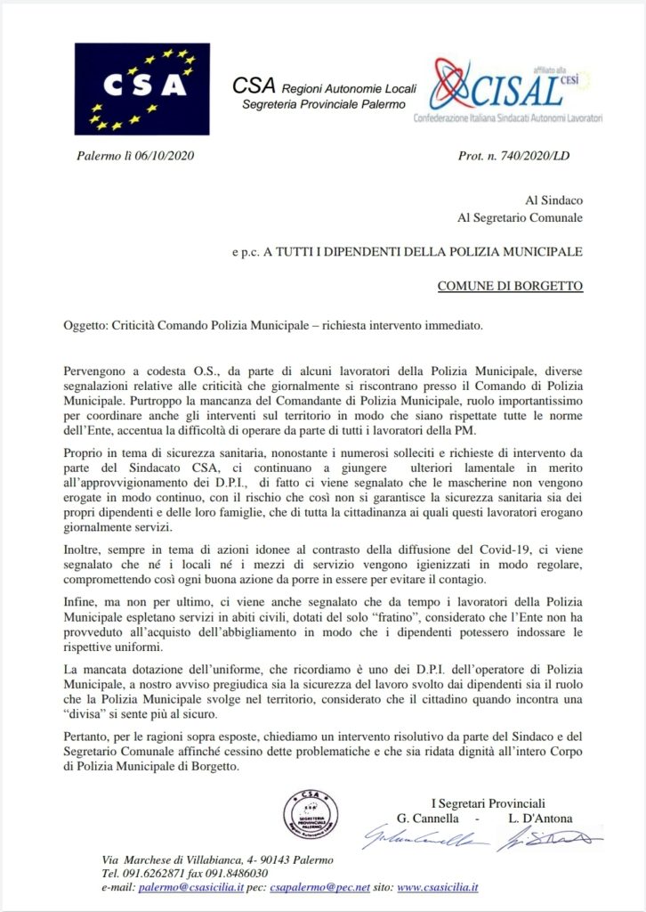 Comando Polizia Municipale di Borgetto Navigazione articoli Comunicato sindacale approvazione CCDI 2019-2021 (parte giuridica) FP CGIL – CSA RAL – UIL FPL, Benessere lavorativo, qualità dei servizi educativi e dell’infanzia.
