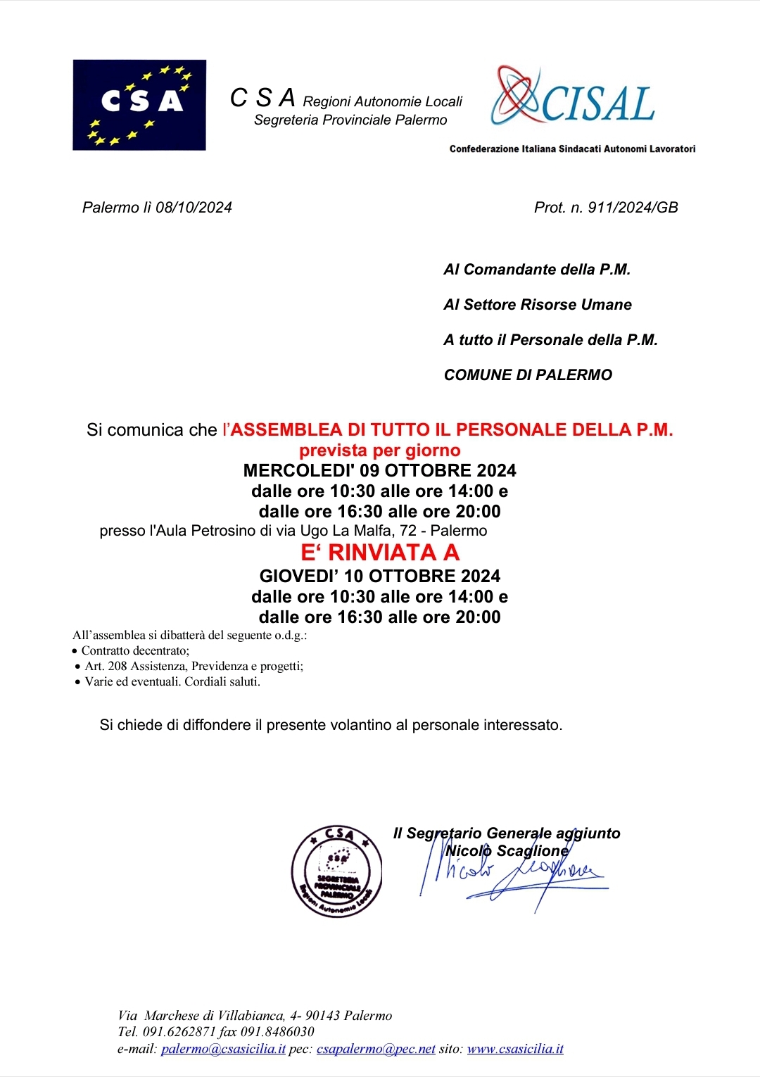 ❌️❌️❌️❌️❌️❌️❌️❌️❌️❌️ Navigazione articoli CSA, Assemblea di tutto il Personale della Polizia Municipale g. 09.10.2024 Enti locali, Csa-Cisal scrive all’Anci Sicilia: “Fronte compatto per aiutare comuni ed ex province”