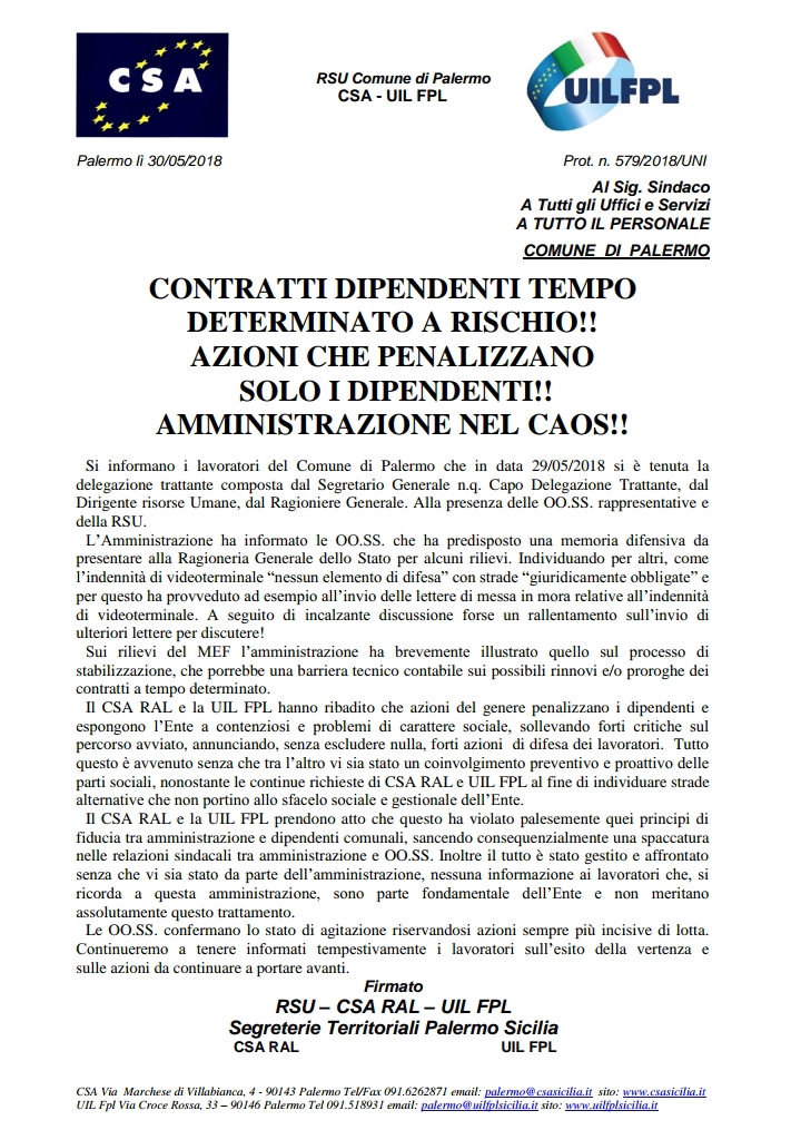 Navigazione articoli Nuove zone di parcheggio nella città a pagamento anche per i dipendenti del Comune di Palermo: il CSA dice basta!!!! CSA – UIL FPL, Richiesta convocazione immediata tavolo specifico problematiche lavoratori a t.d.