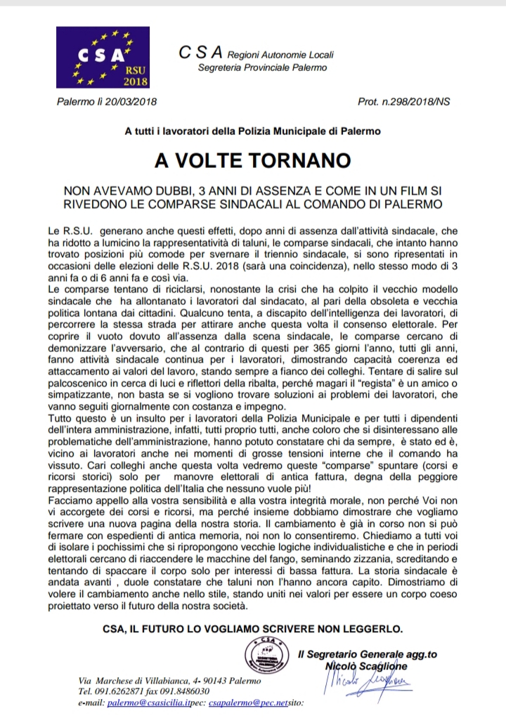Navigazione articoli CSA Palermo, Situazione autoparco via Carlo Amore CSA, Volantino sollecito piano triennale ex art 13 l.r. 17/90