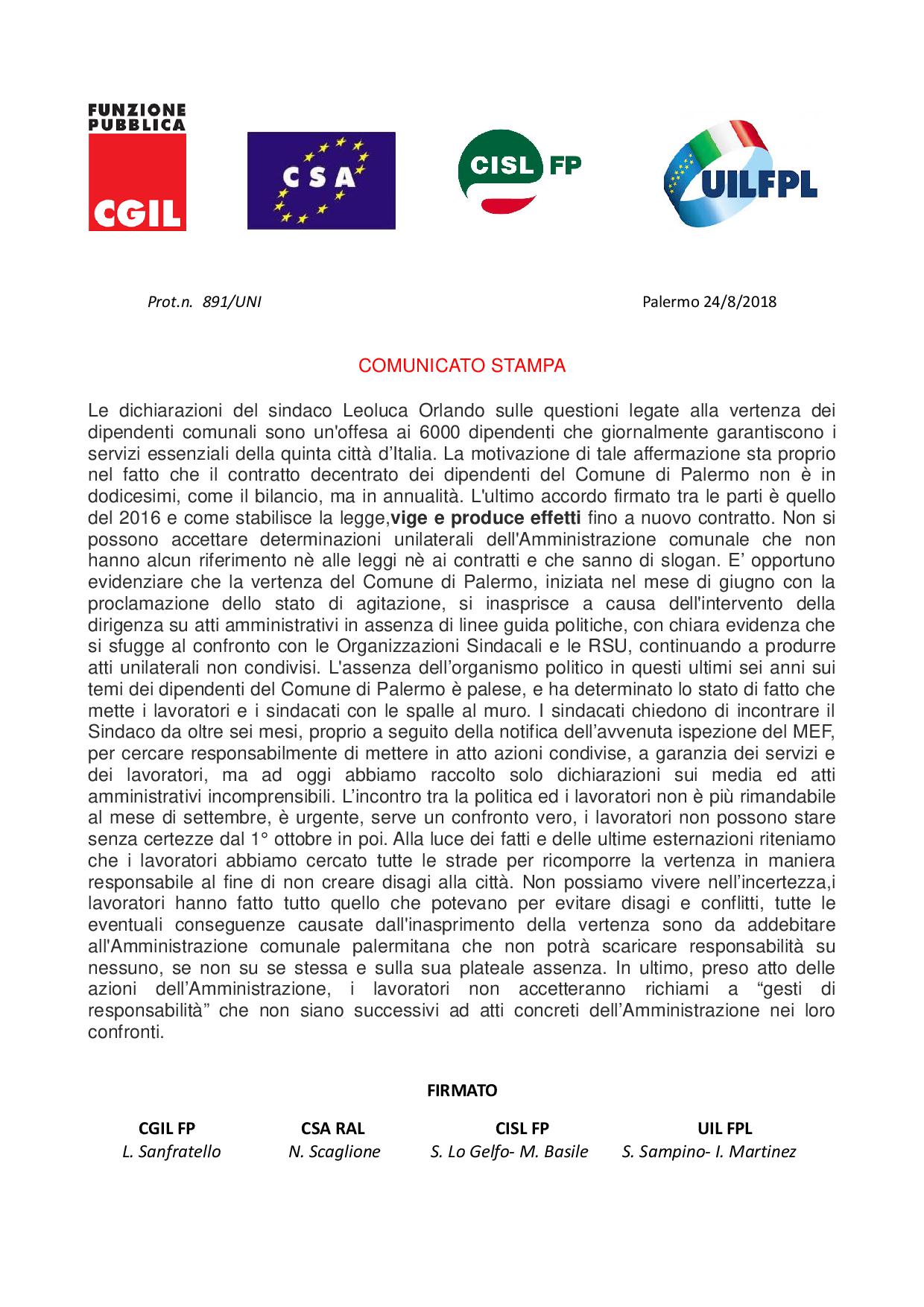 Navigazione articoli Il commento dei Sindacati a www.palermotoday.it su Giunta approva il Piano triennale 2018-2020 per il miglioramento dell’efficienza dei servizi della Polizia Municipale Articolo di Palermo Today su Vertenza dipendenti Comune, sindacati pronti al braccio di ferro: “No ad atti unilaterali” „Vertenza dipendenti Comune, sindacati pronti al braccio di ferro: “No ad atti unilaterali”