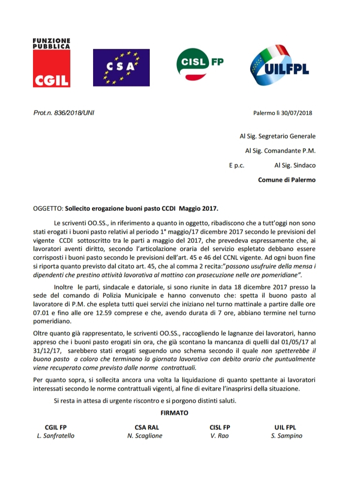 Navigazione articoli CSARAL-FPCGIL-CISLFP-UILFP: Disposizione di servizio di prot. REGINT/2018/15296/STSC. (Polizia Municipale) CSARAL-FPCGIL-CISLFP-UILFPL: Atto di costituzione in mora – diffida.