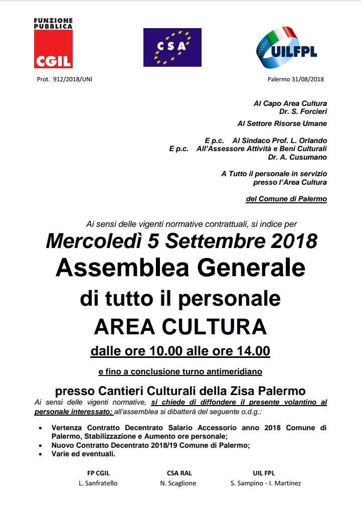 Navigazione articoli CSARAL-FPCGIL-UILFPL, Richiesta chiarimenti relativi alla mail dell’ufficio servizi centralizzati del 30.08.2018 a firma del Comm. G. D’Agostino Problematiche Personale Comunale, Lettera convocazione del Sindaco di Palermo – ERRATA CORRIGE (inserito un destinatario)