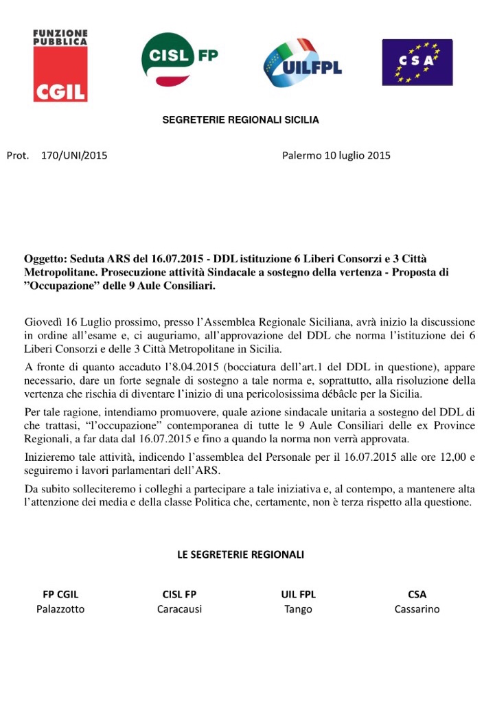 exProvince Sicilia: Seduta ARS del 16-07-15 – DDL istituzione Liberi Consorzi e 3 Città Metropolitane Prosecuzione attività sindacale a sostegno della vertenza – Proposta di occupazione delle 9 Aule Consiliari