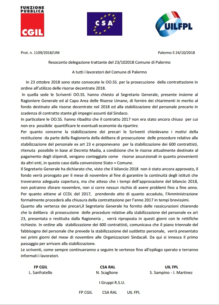 Navigazione articoli CSA, Corso “addetto ai servizi informatici” per personale ASU/LSU FP CGIL- CSA RAL- UIL FPL, Richiesta audizione per stabilizzazione personale precario e Piano Miglioramento