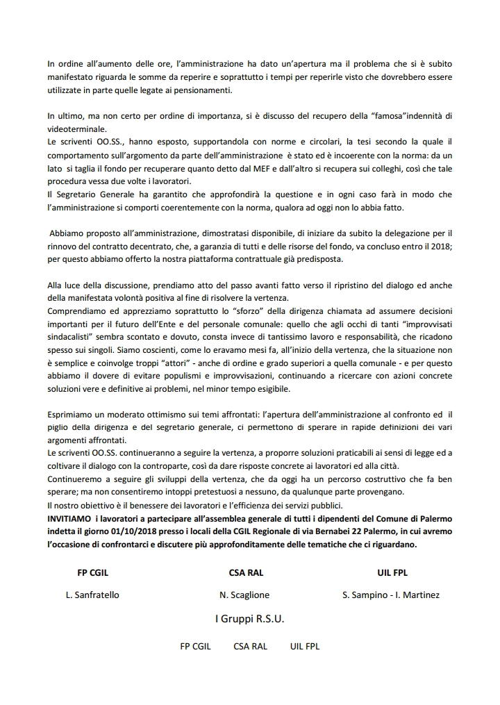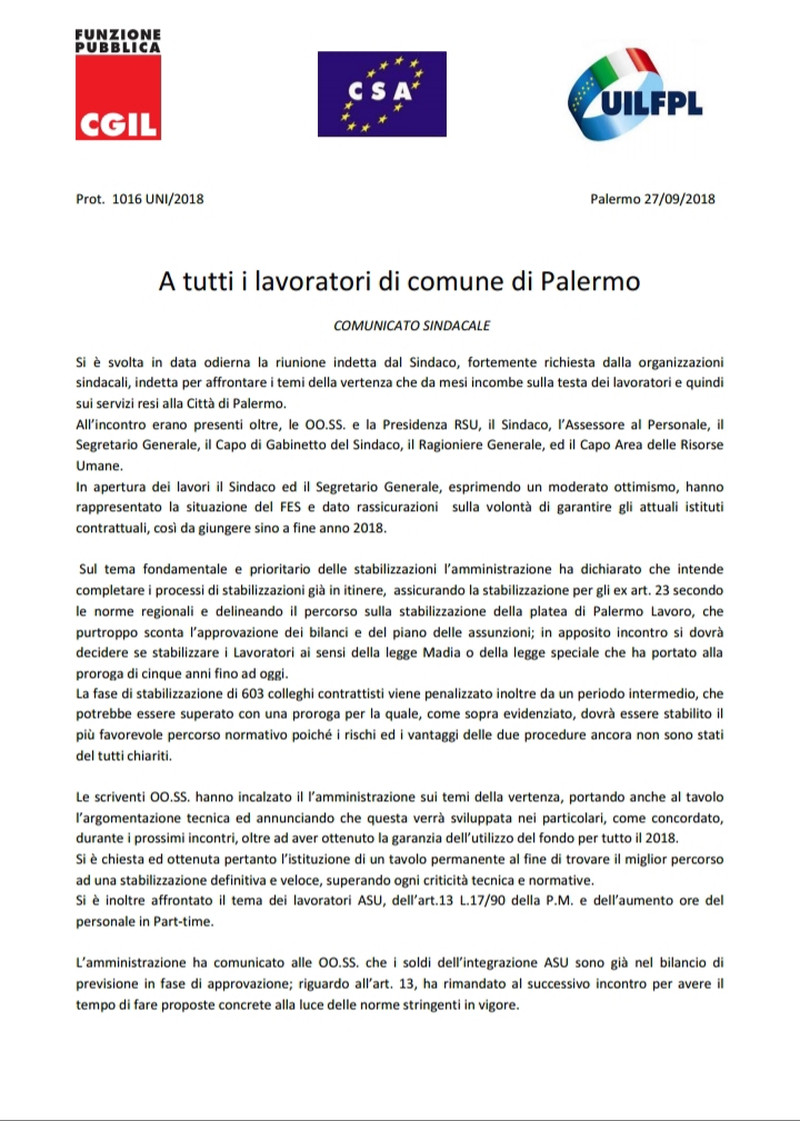 Navigazione articoli FpCgil-CsaRal-UilFpl, Assemblea generale dipendenti Comune di Palermo g. 01.10.2018 Fp CGIL – CSA RAL- UIL Fpl ASILI NIDO Richiesta incontro