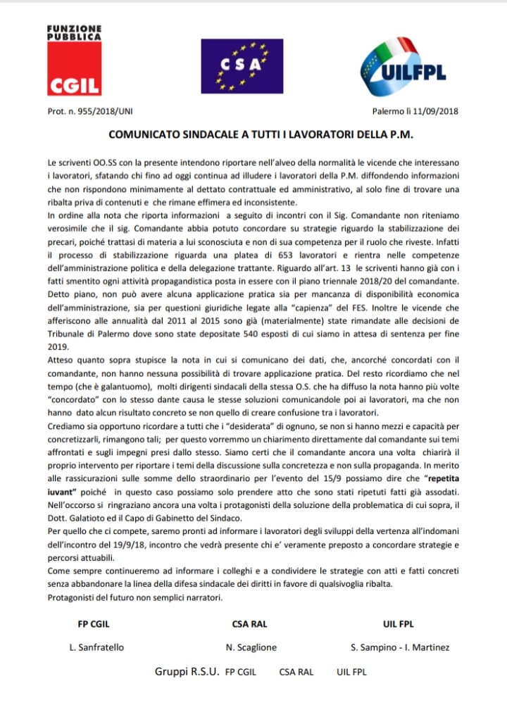 Navigazione articoli FpCgil-CsaRal-UilFpl, Primi risultati vertenza Comune di Palermo. RLS, Tutela della salute e prevenzione dei rischi e delle malattie professionali dei lavoratori della P.M. D.Lgs. 81/2008 e ss.mm.e ii. -DIFFIDA.