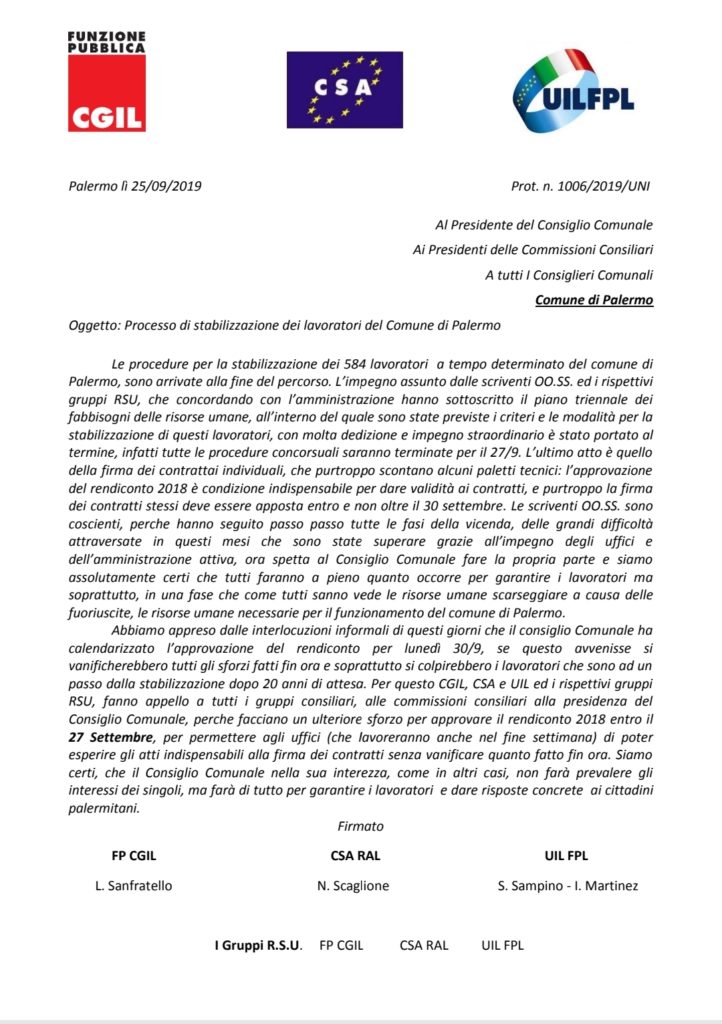 Navigazione articoli Invito inaugurazione g. 26 Settembre 2019 ore 16,30 CSARAL-CGILFP-UILFPL, Comunicato stampa stabilizzazioni Comune di Palermo