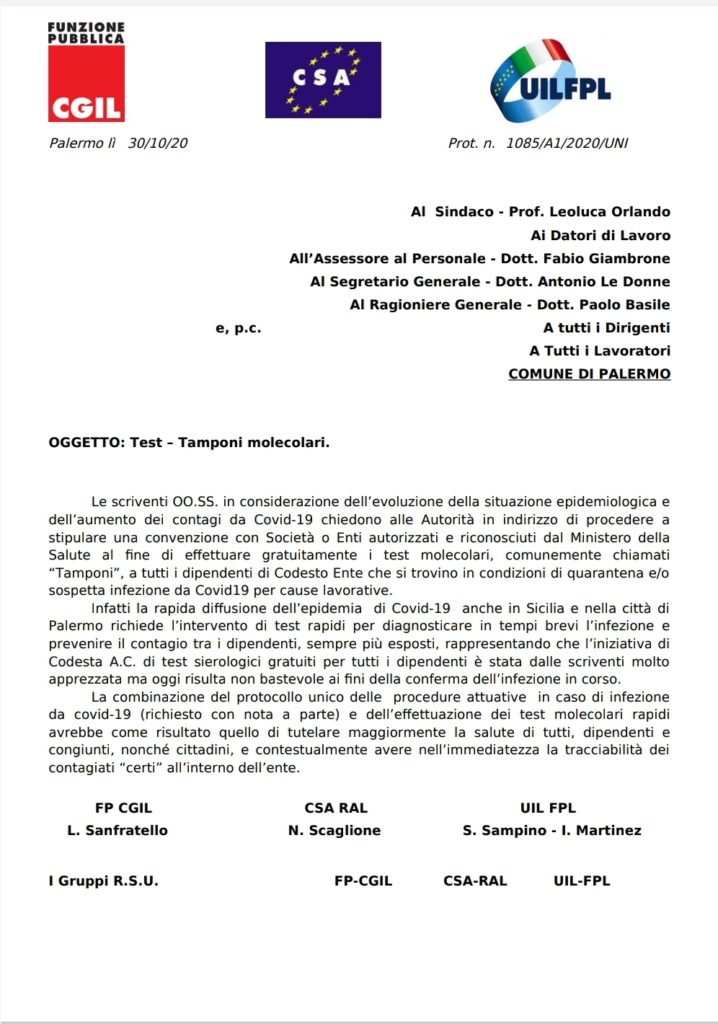 Comune di Palermo Navigazione articoli CSA, Emergenza Sanitaria COVID 19 sollecito rispetto misure di sicurezza e tutela lavoratori Ente FPCGIL-CSARAL-UIFPL, Richiesta incontro urgente per la prosecuzione del CCDI parte economica 2020.