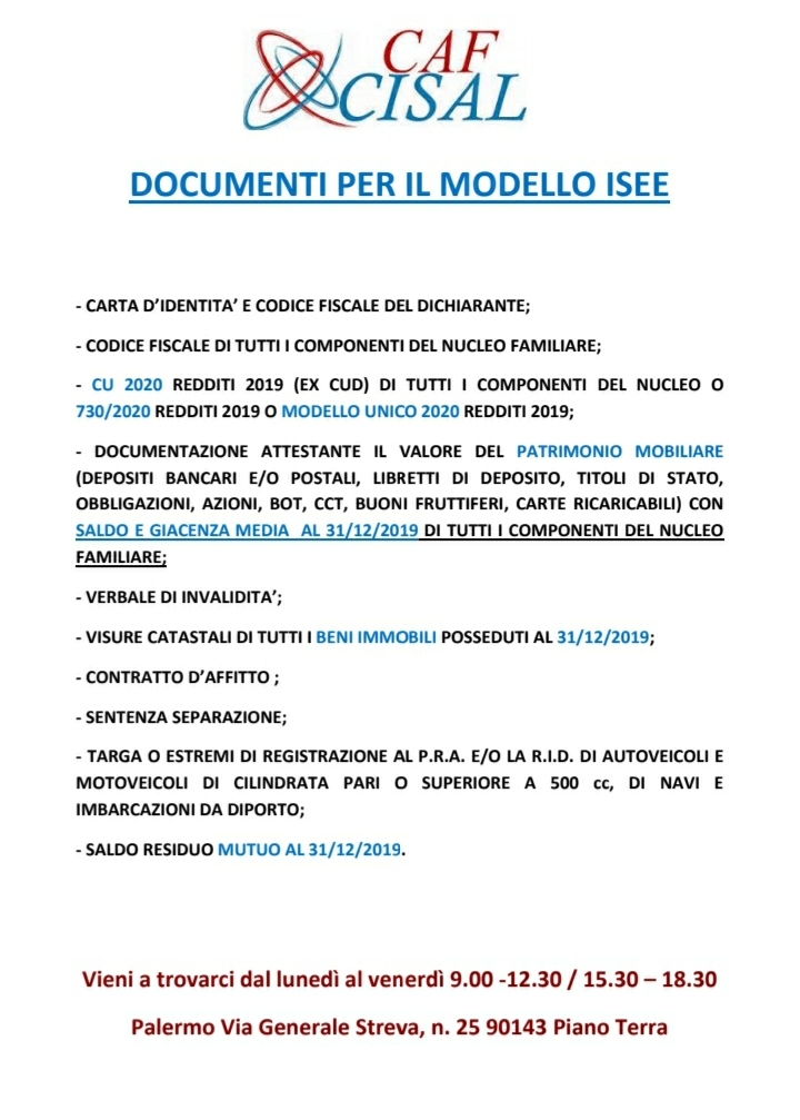 Vi preghiamo di non prendere in considerazione l’allegato della precedente mail, attestante la documentazione ISEE 2021, in quanto è stato erroneamente inserito come reddito quello del 2018, invece che del 2019 (sono necessari, infatti, il modello 730 o Reddito Persone Fisiche 2020 o, se non presentati, la CU 2020, riferiti ai redditi 2019, di tutti i componenti del nucleo familiare).